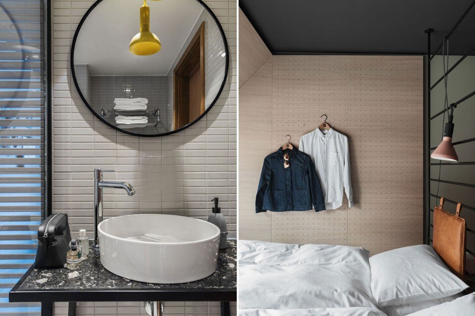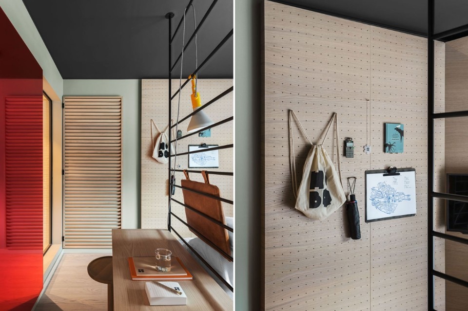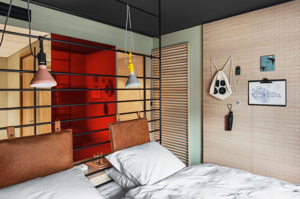 Le camere sono definite da un letto centrale e indipendente, orientato verso la finestra che è incorniciata da una costruzione in legno a forma di imbuto a sottolineare i serramenti orizzontali degli anni Settanta. Il letto è collegato, attraverso un telaio in metallo, a una scrivania che serve anche per appendere lampade o oggetti personali. L’atmosfera insolita delle camere è modellata da un lungo specchio rosso o verde e dalla grande vetrata che separa la zona doccia. Tutti gli arredi – armadio, sgabello in sughero e comodini – sono edizioni dello Studio Aisslinger.