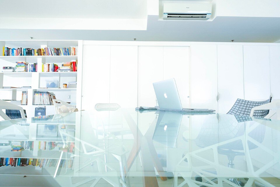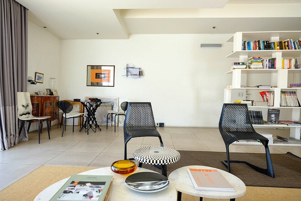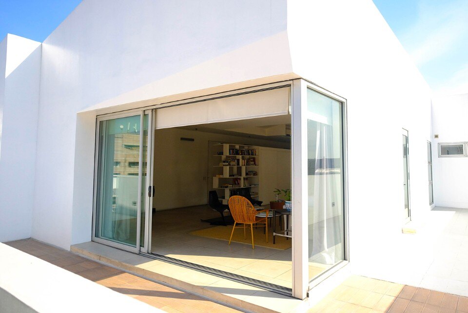 In contrasto con il paesaggio post-industriale del quartiere, l’appartamento all’esterno appare minimalista ed è completamente verniciato di bianco. Il suo interno è caratterizzato dall’uso di materiali ordinari e da una sistemazione informale degli arredi. Si ispira all’intorno caotico e prova a creare una narrativa con la combinazione di oggetti diversi tra loro. Un grande armadio monolitico separa il soggiorno dalla zona pranzo. L’appartamento dispone di finestre di grandi dimensioni, favorendo l’ingresso abbondante di luce naturale, che si riflette con leggerezza in tutta l’abitazione.