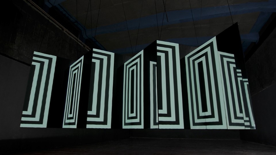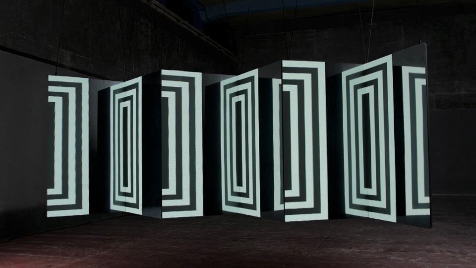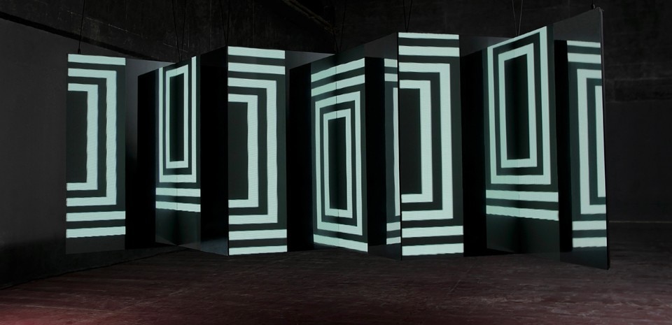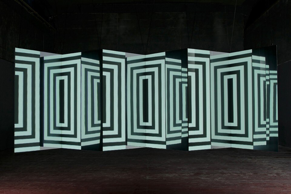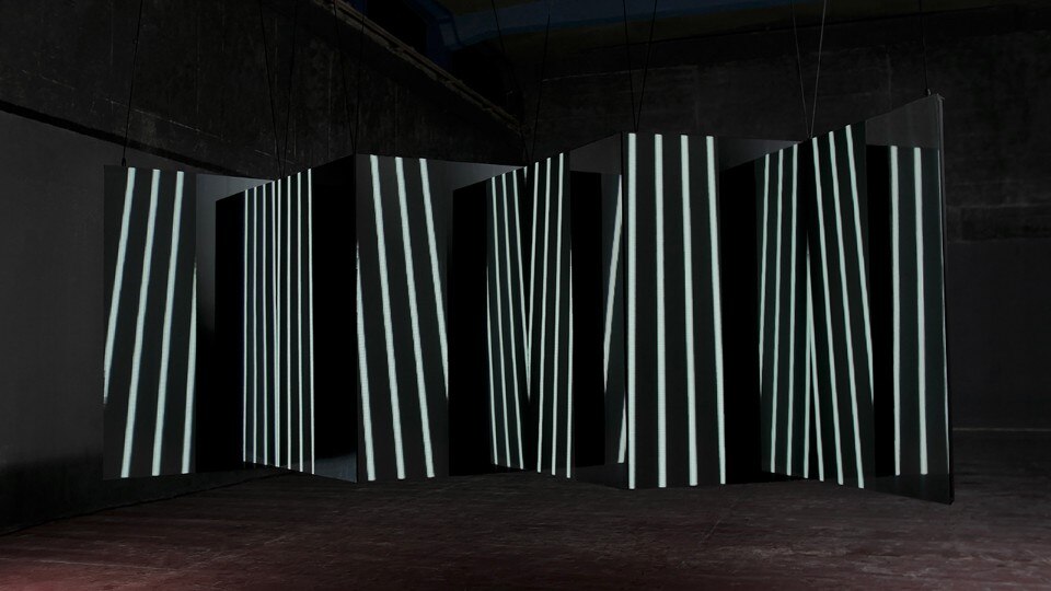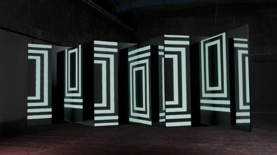 L’animazione interpreta alcune forme geometriche semplici e crea illusioni ottiche. La configurazione dei piani ha una forma a zig-zag, in cui le superfici frontali sono proiettate o formate da pannelli a led, mentre quelli perpendicolari sono di superfici specchianti. I piani sono fissati a una struttura di alluminio leggera. L’installazione è facile da montare e trasportare.