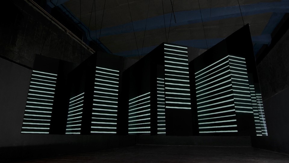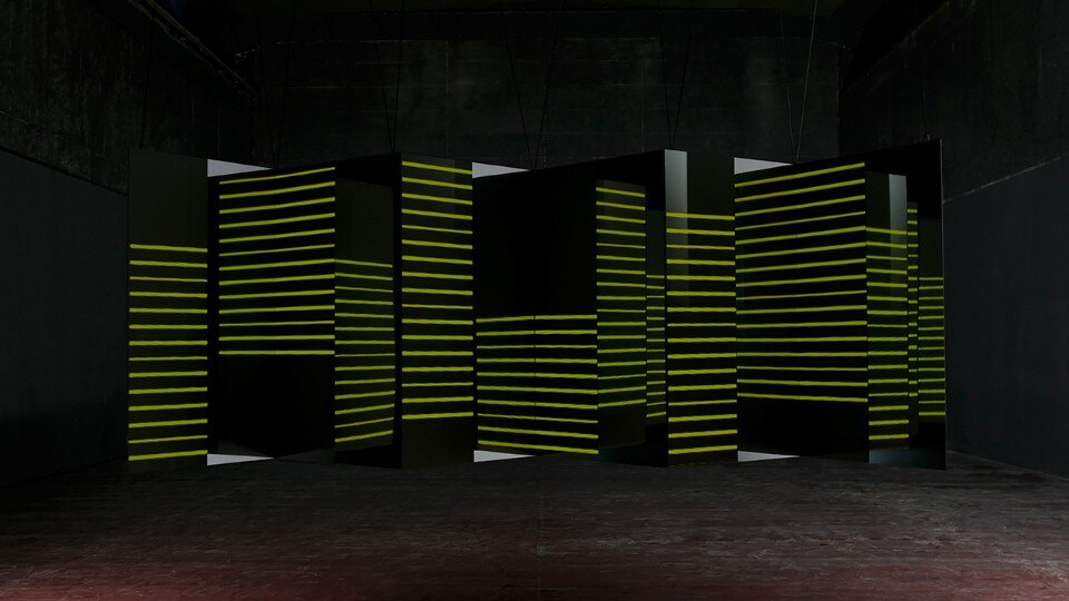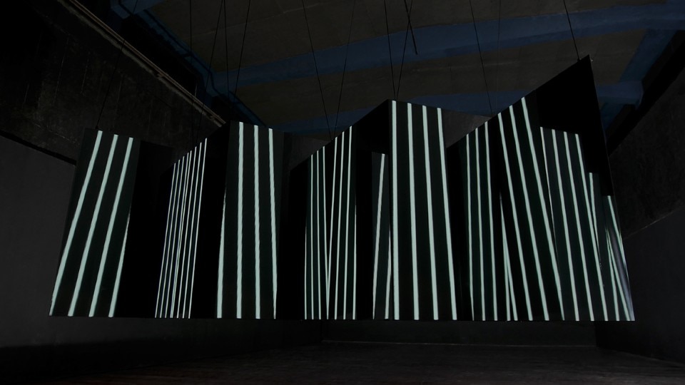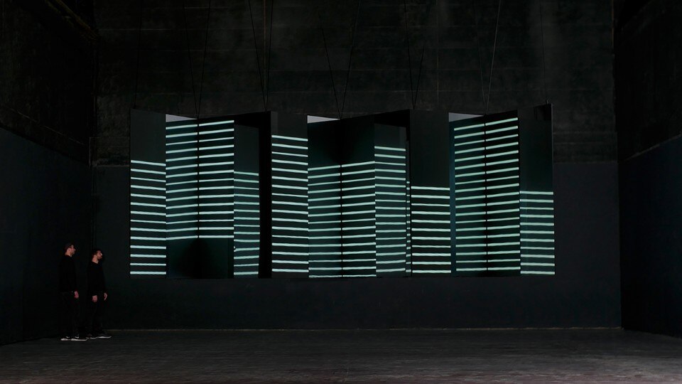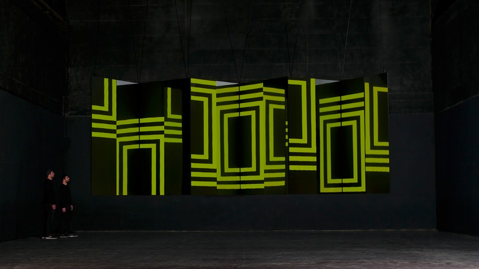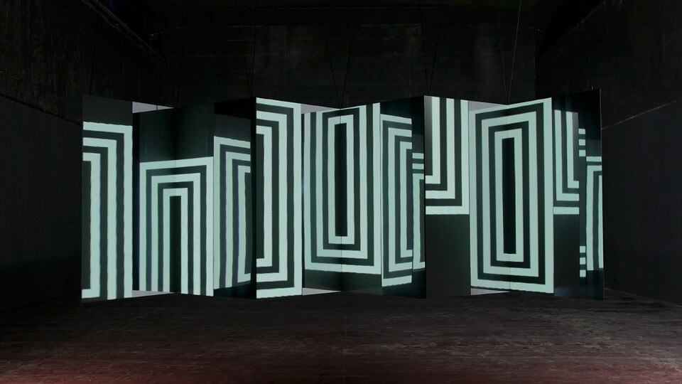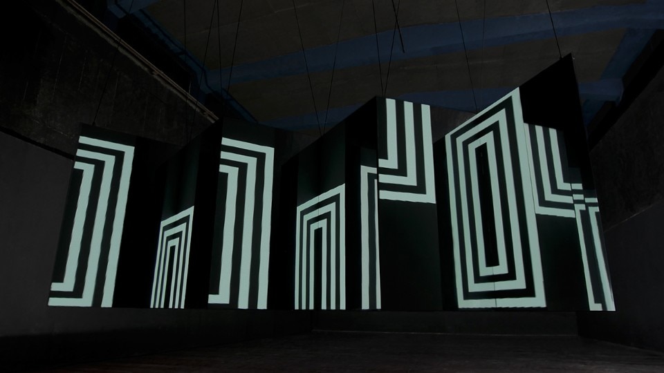 L’animazione interpreta alcune forme geometriche semplici e crea illusioni ottiche. La configurazione dei piani ha una forma a zig-zag, in cui le superfici frontali sono proiettate o formate da pannelli a led, mentre quelli perpendicolari sono di superfici specchianti. I piani sono fissati a una struttura di alluminio leggera. L’installazione è facile da montare e trasportare.