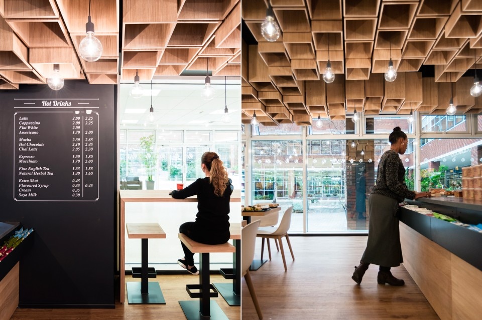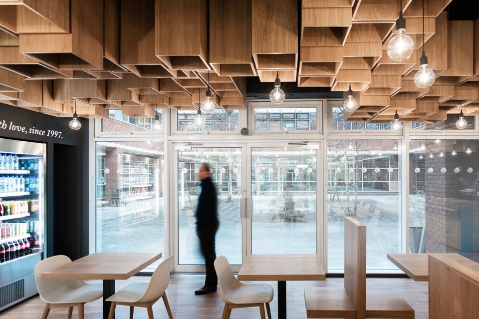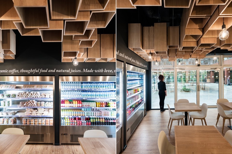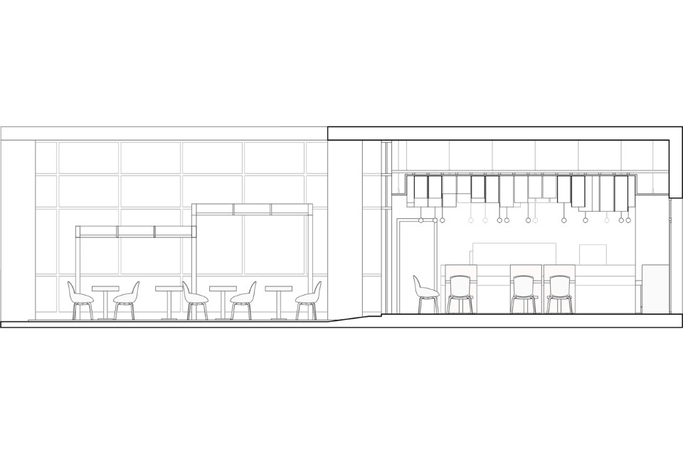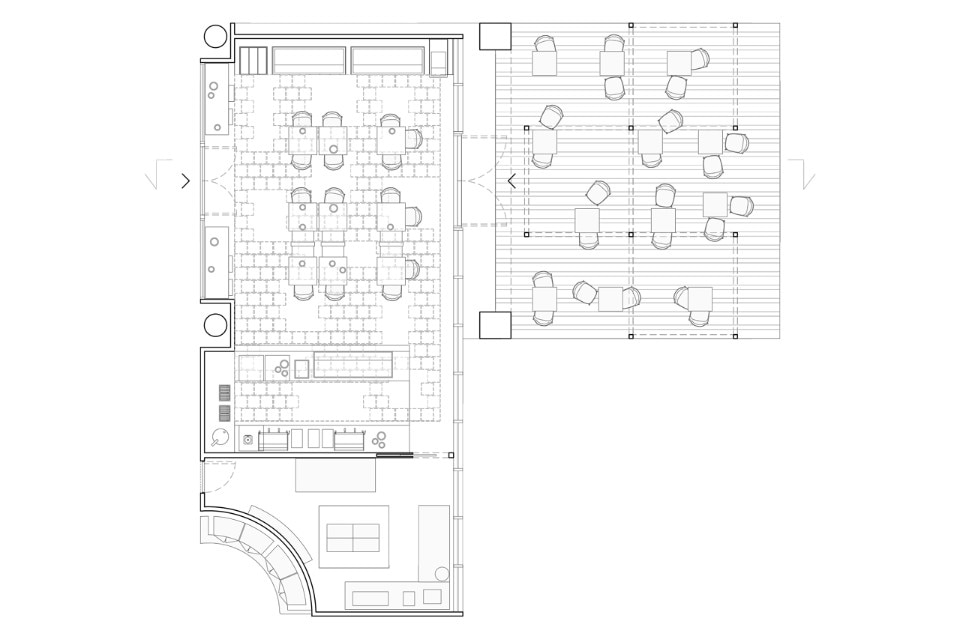 Il cliente si ritrova avvolto dal calore del legno in un ambiente moderno e minimale ma al tempo stesso domestico e familiare. I medesimi materiali trovano spazio anche sul bancone principale e sui complementi di arredo; panche e tavoli sono disegnati da Modourbano e configurano l’open space in piccole zone dalla privacy controllata.
