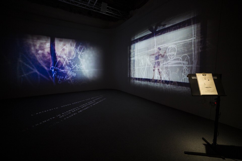 L’installazione interattiva ci accoglie nello studio del progettista, tra modelli architettonici e raccolte di schizzi. È sufficiente prendere il blocco “giusto”, facendosi catturare dal titolo o incuriosire dal disegno in copertina, e posizionarlo sul vicino leggio. Così facendo, di fronte a sé, si avvia un inedito contributo multimediale. Comincia la narrazione. Filmati e immagini si animano sulla superficie verticale. Cambia il blocco di schizzi, cambia il progetto, cambia la proiezione. Pochi secondi di visione e poi nuovamente la scelta di un tema differente.
