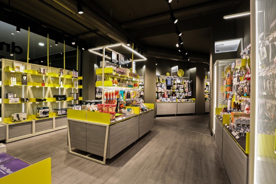 Costruito attorno a una eterogenea offerta di prodotti, l’allestimento è una sorta di “machine à montrer” versatile e flessibile e nuovo luogo identitario del rinnovato brand e come progetto pilota del nuovo format di allestimento per tutti i successivi punti vendita. Gli interni ruotano intorno al progetto di illuminazione, dove la luce è emessa direttamente dagli arredi e scandisce e incornicia la suddivisione dei prodotti. Lineari barre luminose ritmano le vetrine e gli arredi murari, incorniciando poi aree specifiche su prodotti selezionati, mentre anelli luminosi sospesi definiscono, le isole centrali.
