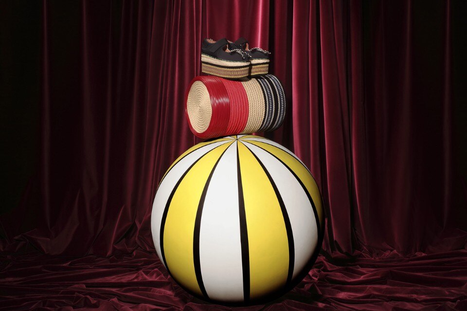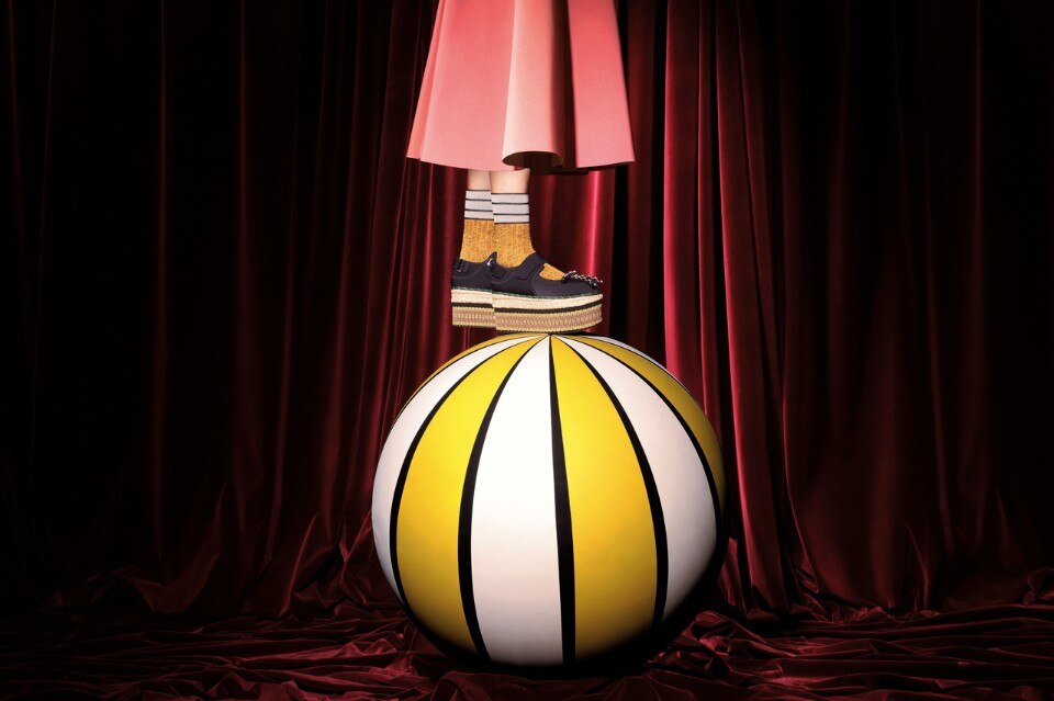 Ispirate all’abbigliamento sportivo, uniscono tessuti tecnici e chiusura a velcro con romantiche decorazioni a fiocco, di cristallo. Il nastro di cotone presenta una grafica combinazione di colori ambrati contrastati dal cordoncino tubolare colorato. La collezione è completata dal calzino abbinato in omaggio i cui colori riprendono quelli della maxi zeppa. La scarpa è disponibile solo online e nelle principali boutique di Milano, Londra e Parigi.