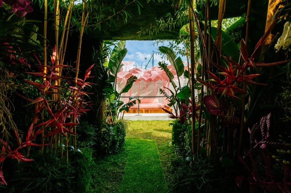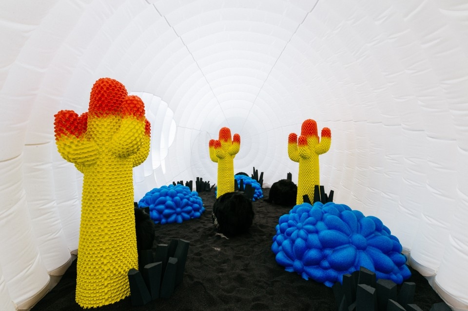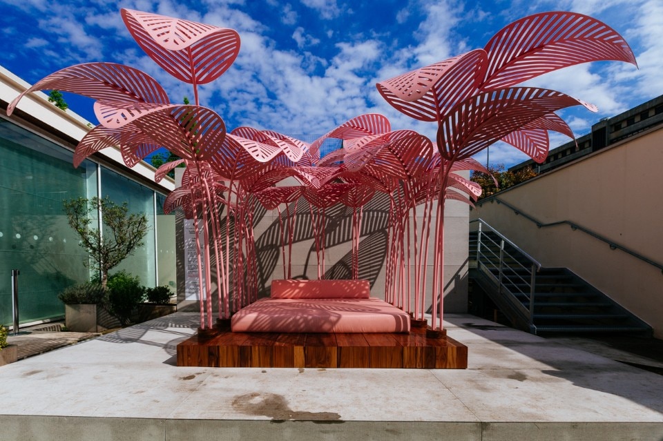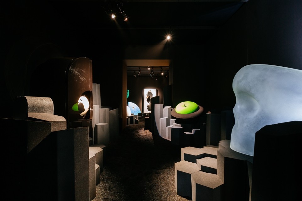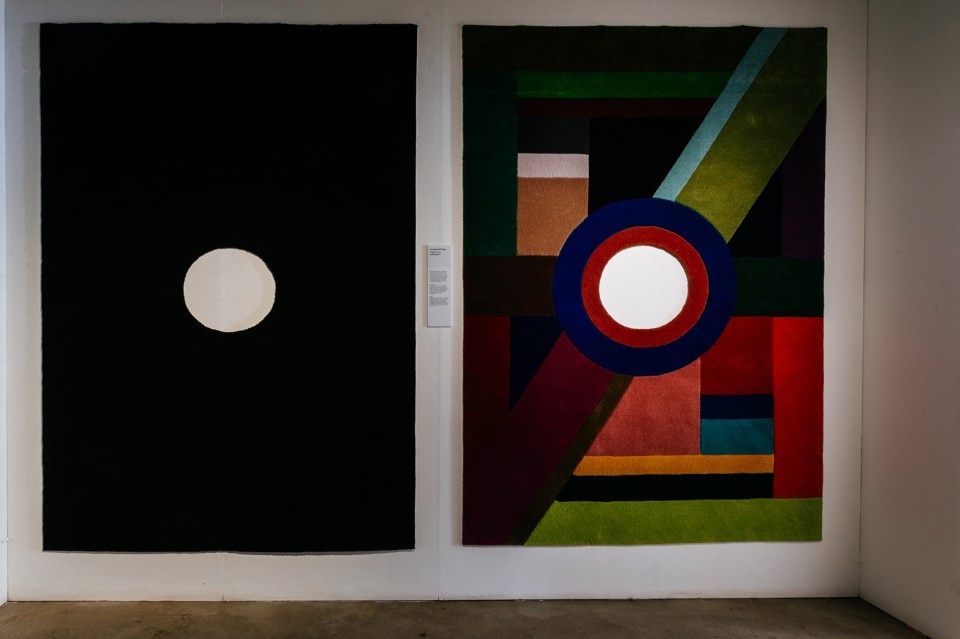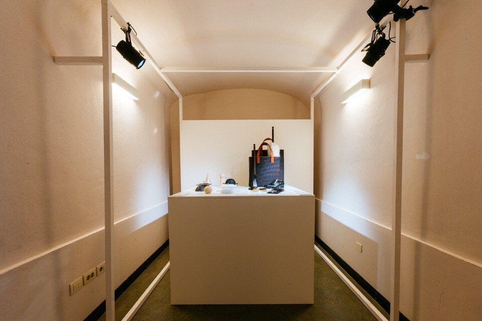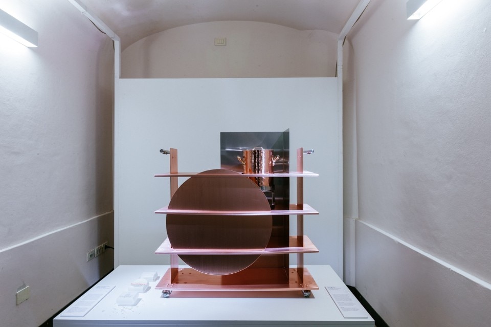 "HolyHandmade", veduta della mostra alla Mediateca Santa Teresa, Milano, 2017. Sullo sfondo The Veil dei fratelli Bouroullec e Lésage Intérieurs