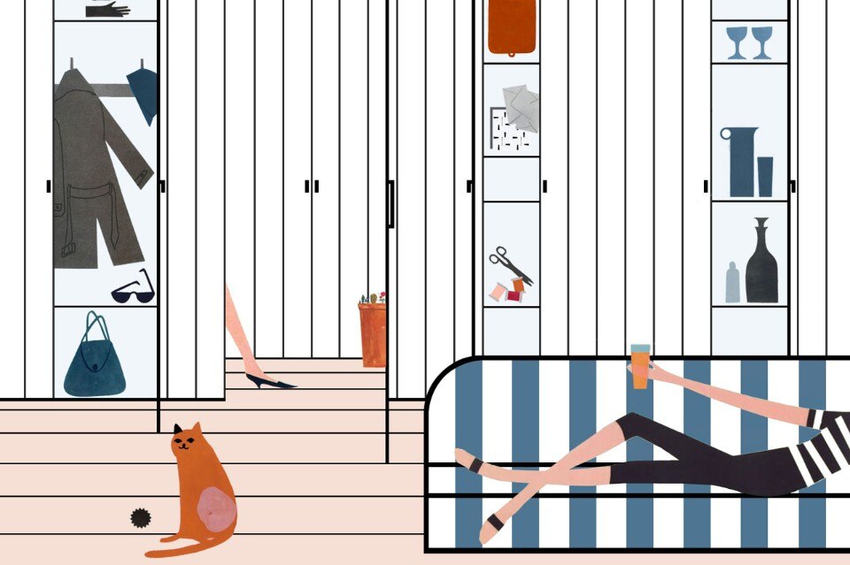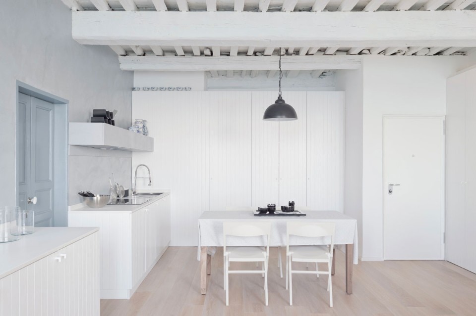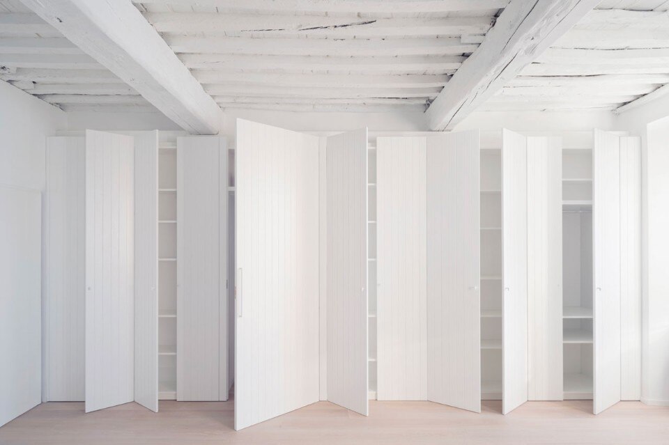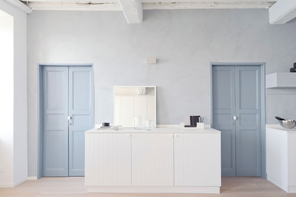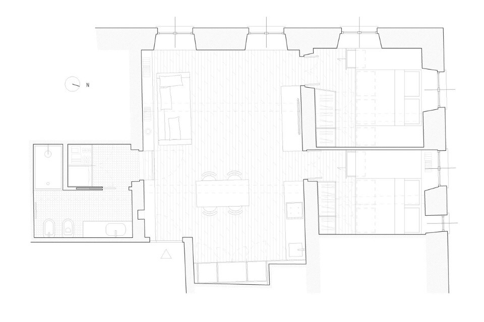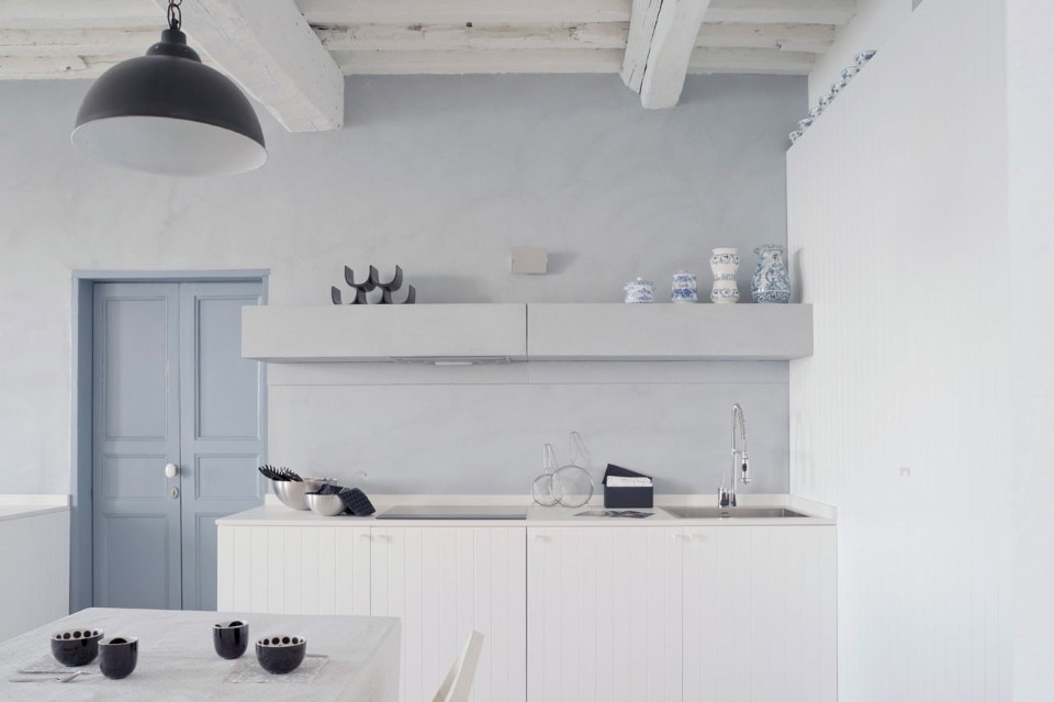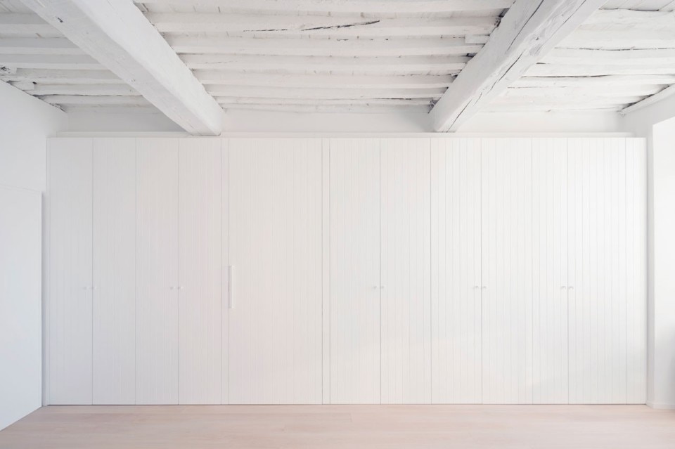 L’abitazione è organizzata attorno a un grande spazio centrale, occupato dalla zona giorno, che affaccia sul mare attraverso due finestre. Dietro alla parete rivestita di resina grigia si trovano due camere da letto, che comunicano col soggiorno attraverso le due porte esistenti che sono state recuperate e riverniciate. Gli altri due lati dello spazio principale sono delimitati da un grande mobile bianco a forma di “L”, all’interno del quale trovano collocazione tutti gli elementi di servizio della casa.