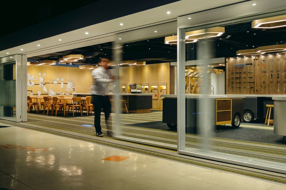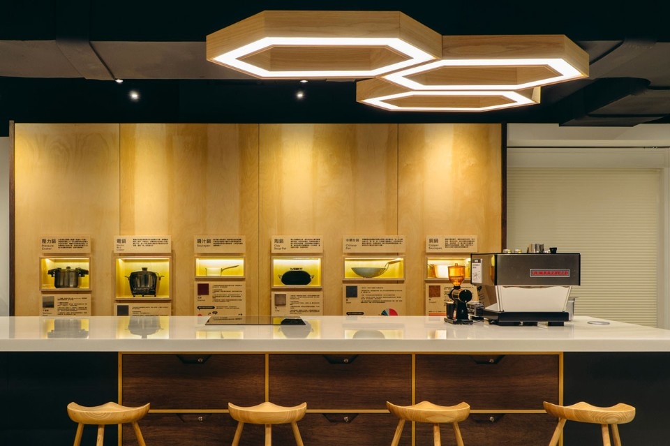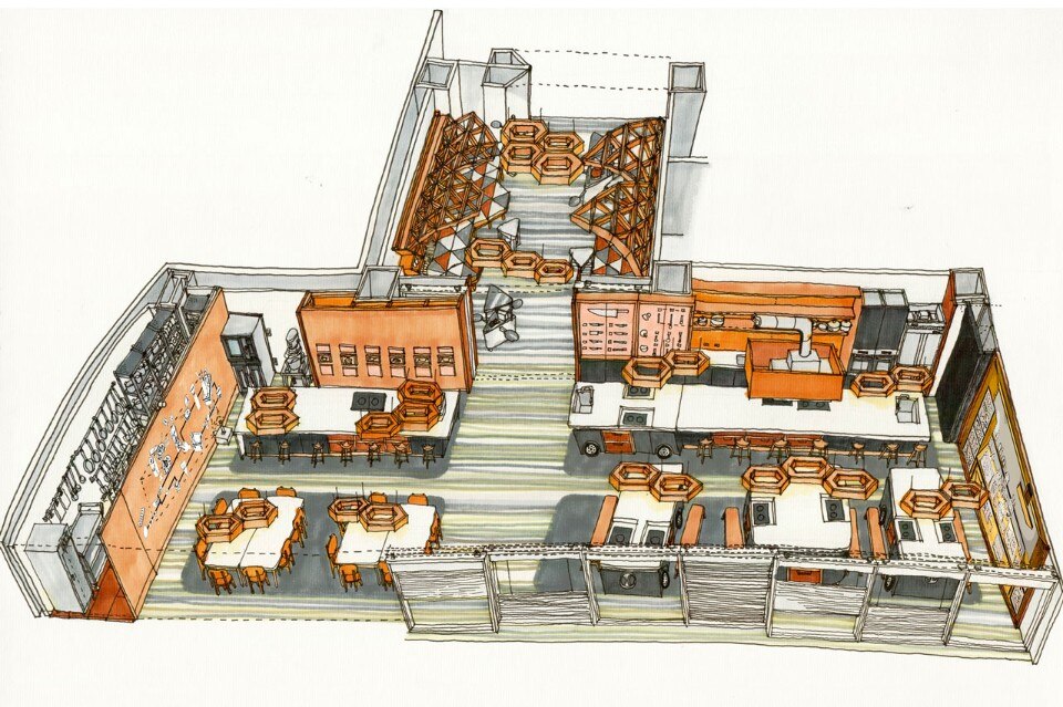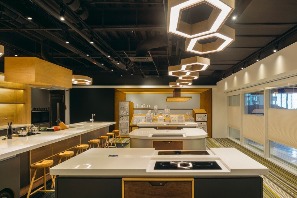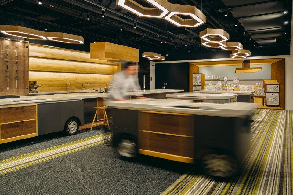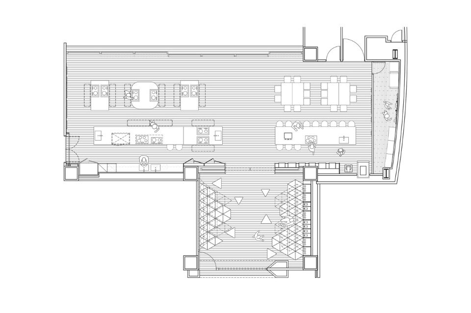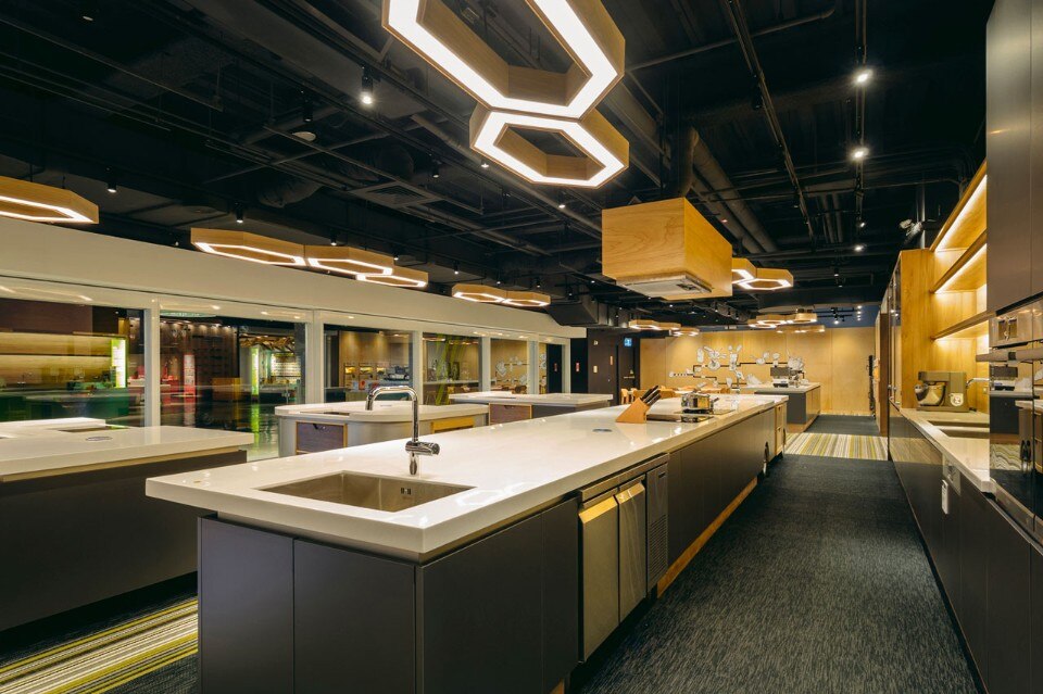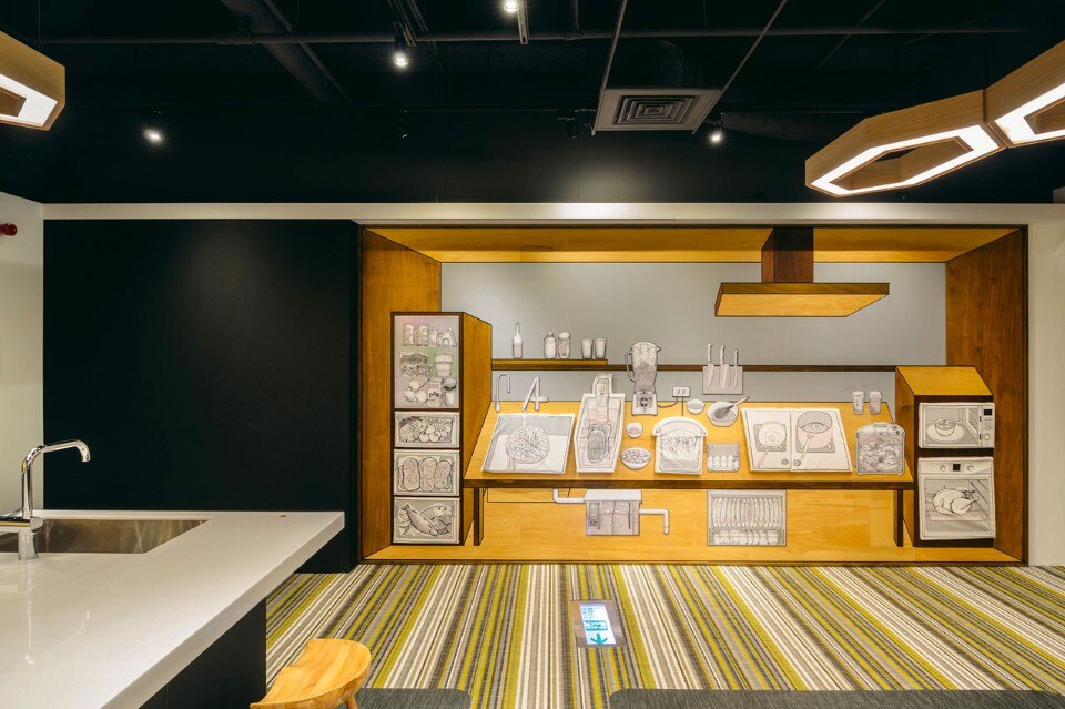 In pianta la cucina ha una forma a “T” ed è divisa in tre zone: una cucina, una tavola fredda e uno spazio per lo svago e il relax. Le prime due zone sono separate da uno spazio rettangolare, in modo da mantenere i bambini piccoli lontani dai fuochi delle cucine. La cucina è formata da una serie di credenze, un bancone per l’insegnante e quattro cucine mobili. La tavola fredda fornisce invece prodotti scaldati al forno e le bevande.