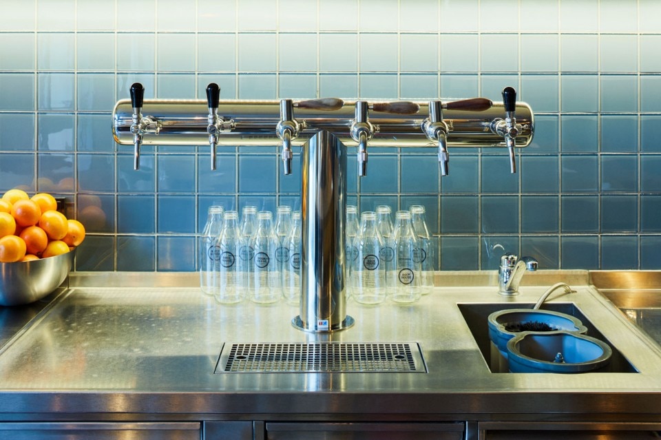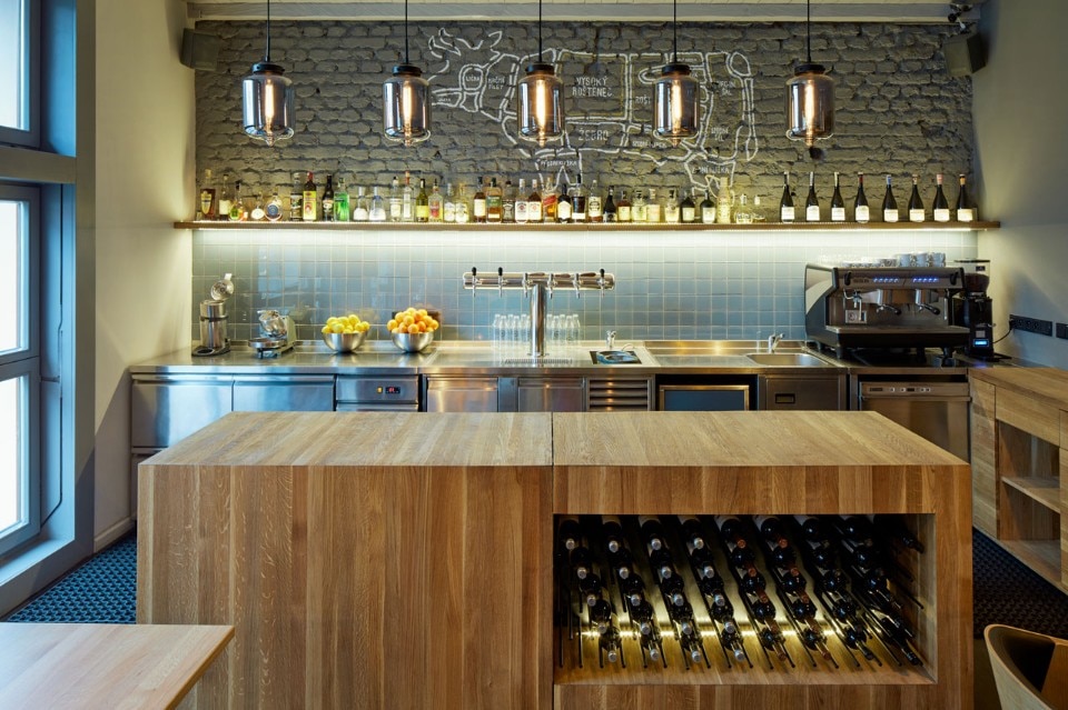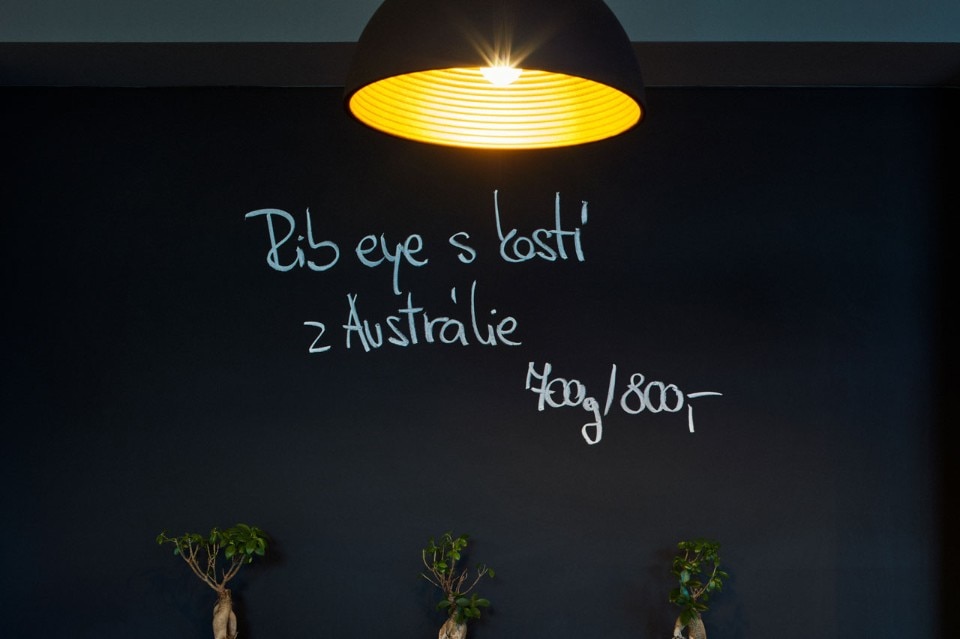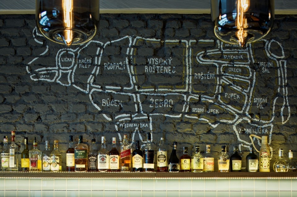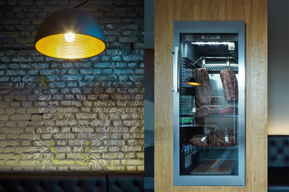 Gli unici elementi rimasti intatti dello spazio originale in stile marinaro sono i soffitti e le travi in legno – verniciati di bianco – e la pavimentazione, verniciata con una tonalità neutra più scura. Per aggiungere un po’ di calore allo spazio, una serie di mobili in legno di rovere si contrappone alle pareti monocromatiche. Elemento chiave del mobilio è il “Dry Ager”, un mobile a vista che funge da stagionatore di carne. L’atmosfera è arricchita da punti luce dalle tonalità dorate, mentre la parete frontale di mattoni è decorata con una grafica di Jakub Šejvl ispirata alle origini delle bistecche.