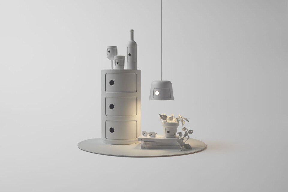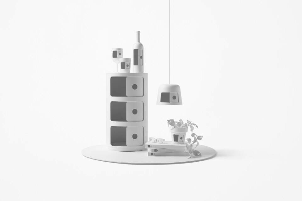 La reinterpretazione di Nendo vede questo oggetto scultoreo come una “grande famiglia” che include tazze, bottiglie di vino e sughero, posizionati tutt’attorno e con gli stessi dettagli dei Componibili. La collezione si allarga a libri, bicchieri, lampade, piante e foglie, che vengono “componibilizzati”.