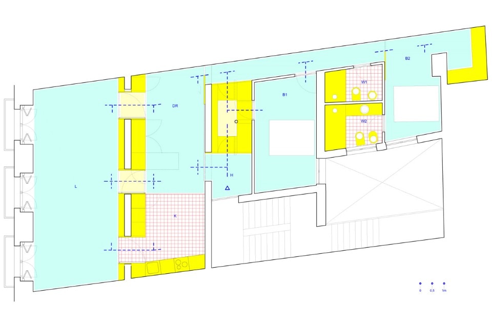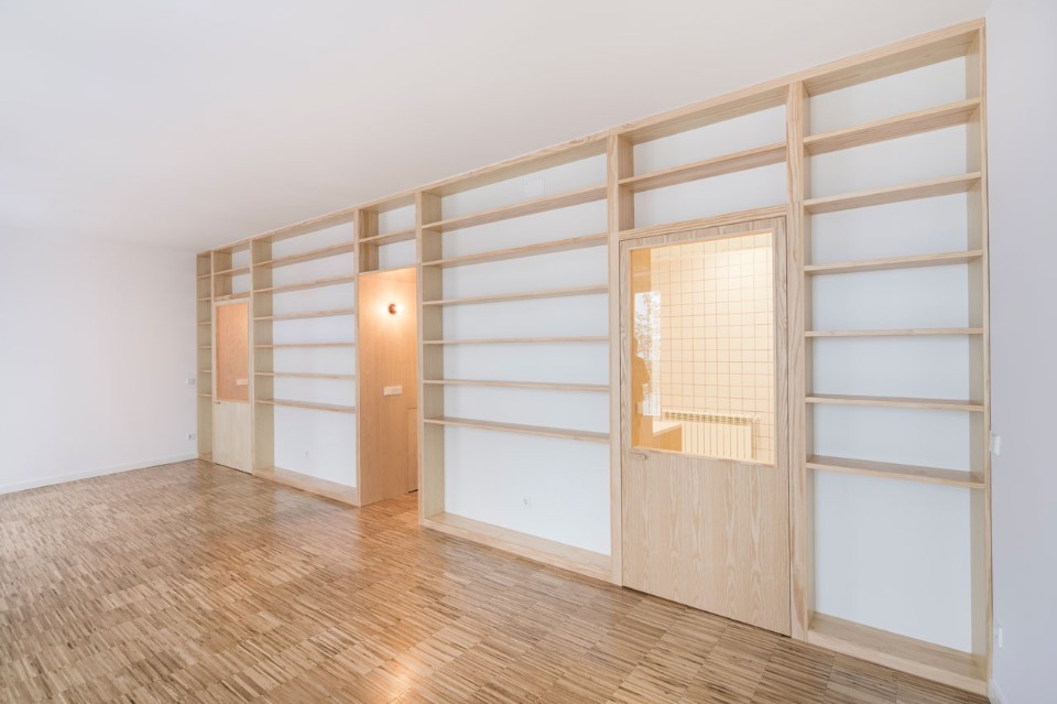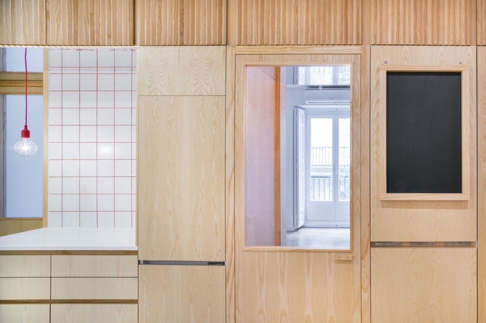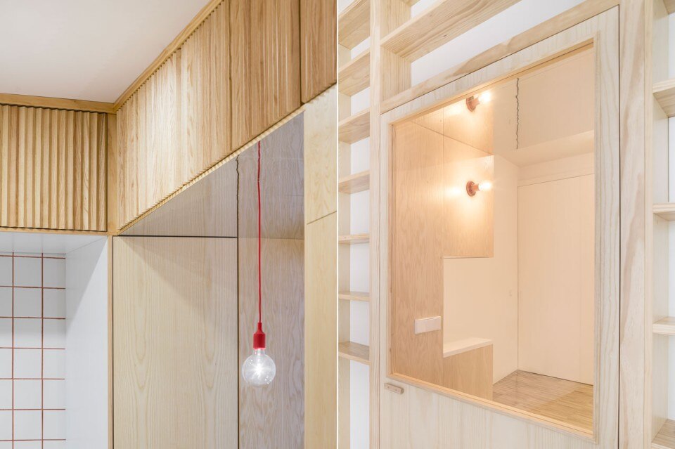 Il salotto e la sala da pranzo sono definiti da un arredo che funge da filtro con la strada: viene utilizzato per per dare ordine agli accessi, contenere l’illuminazione e i servizi tecnici e immagazzinare i vari oggetti della casa. Ci sono anche alcuni compartimenti nascosti e un tavolo ribaltabile.