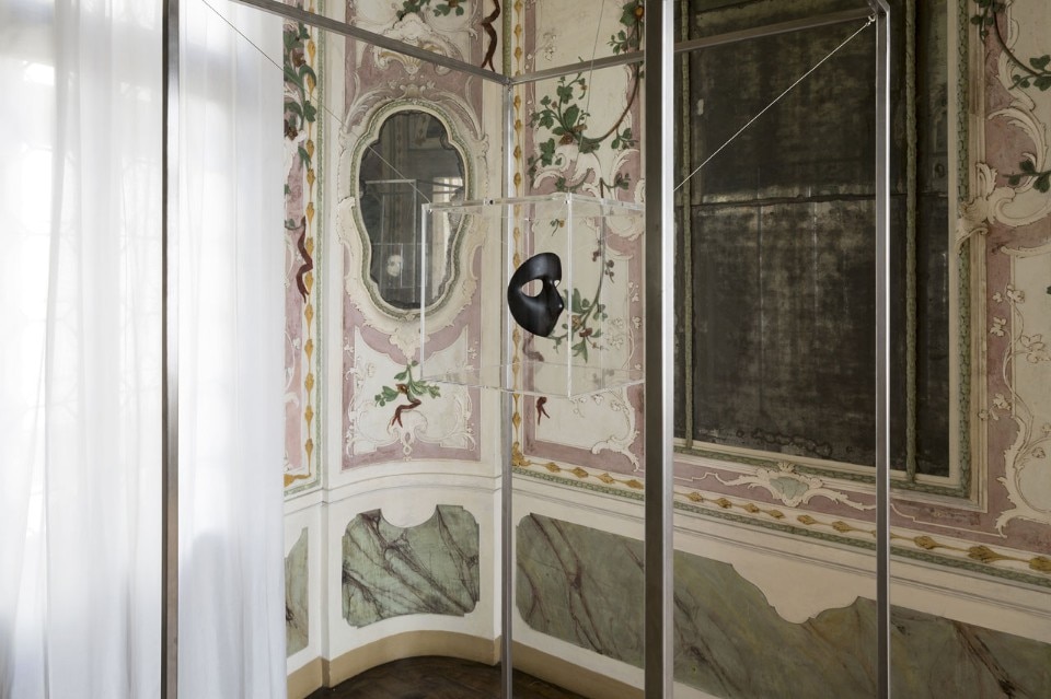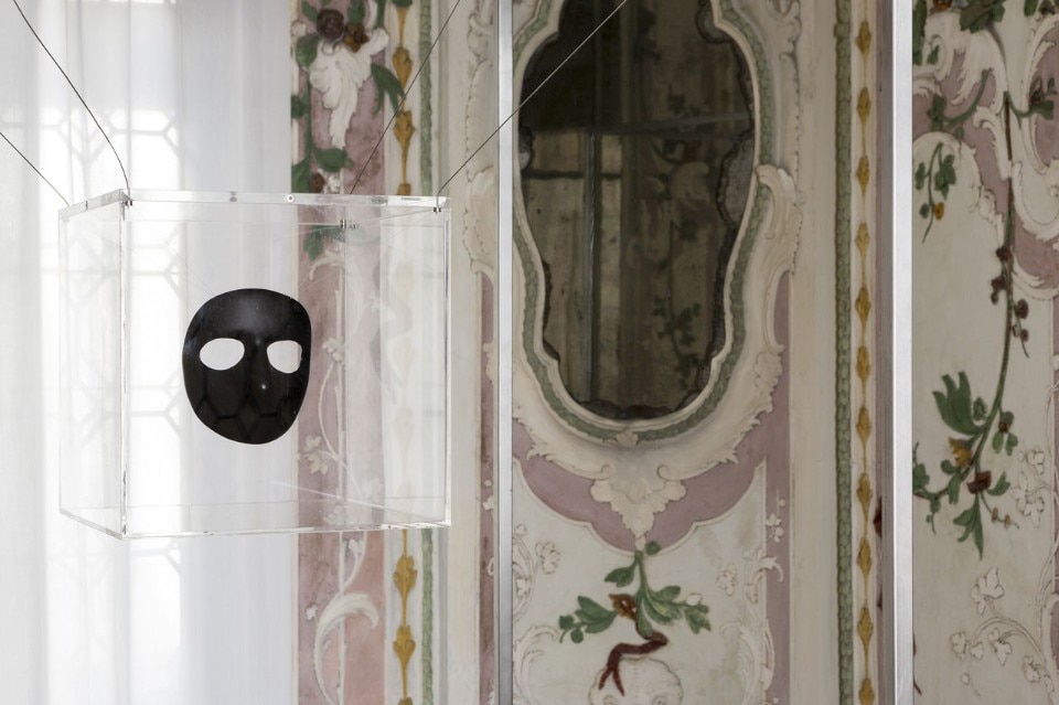 Un’opera di Pietro Longhi, Il Rinoceronte, diventa la citazione di altre due installazioni: Taci, anzi parla e Remains. La prima è la ricostruzione di una Moréta usando un calco del volto dell’artista. Si tratta di una curiosa maschera, come quella indossata dalla dama dalla veste bianca, rappresentata nel dipinto del Longhi: un ovale nero con due buchi in corrispondenza degli occhi. Le donne potevano fermarla sul viso soltanto stringendo tra i denti una mordacchia, rimanendo così costrette a tacere. Grazie a dei fili da illusionista l’opera rimane sospesa al centro di un boudoir – e qui l’artista spiega anche come il termine derivi dal francese bouder, mettere il broncio.