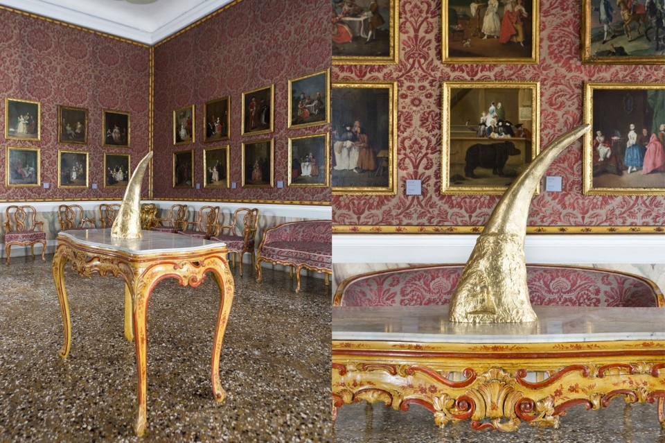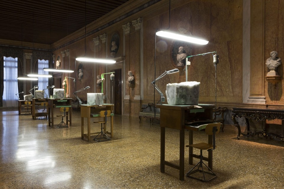 La seconda opera legata a Longhi, Remains, è la ricostruzione di un corno dorato di rinoceronte che traduce la scena rappresentata nel dipinto: un animale divenuto preda inerme, una sorta di attrazione da circo, il cui corno tagliato viene esibito da un uomo come trofeo. Nel grande salone al primo piano, da schiavi e oggetti incatenati a presenze umane, i soggetti del corpus scultoreo degli Etiopi portavaso di Andrea Brustolon praticano metaforicamente un passo in avanti nella loro condizione, grazie a una rotazione di 180° rispetto all’attuale posizione nella collezione. Nel portego de mezo, infine,si trova l’opera La fabbrica illuminata, dove una serie di cinque banchi da orafo, illuminati da luci al neon, sostengono ciascuno un grande blocco di salgemma. L’opera simboleggia l’“oro bianco”, il sale, elemento chiave nella storia commerciale di Venezia e parla dello sfruttamento delle risorse naturali e della forza lavoro necessaria per la loro trasformazione.