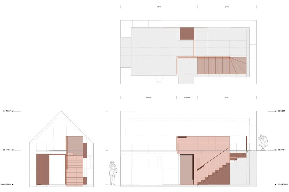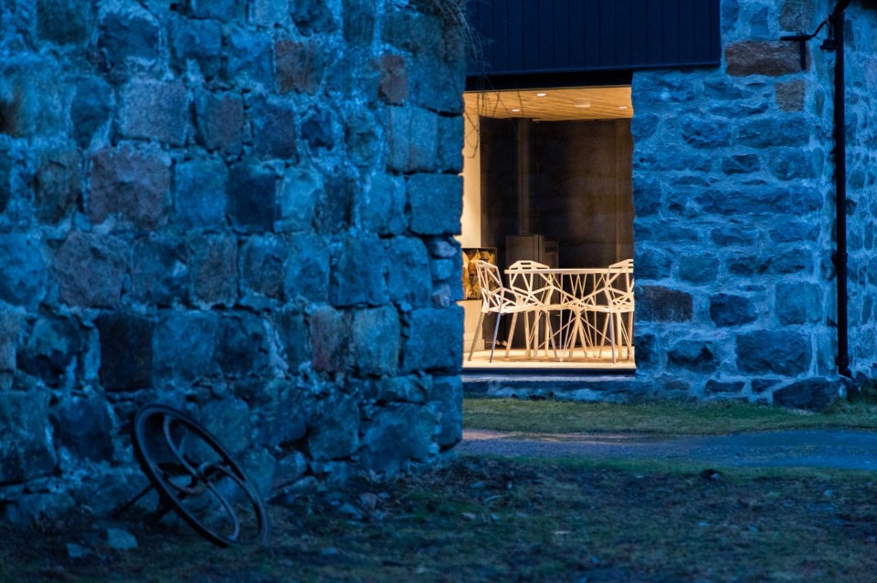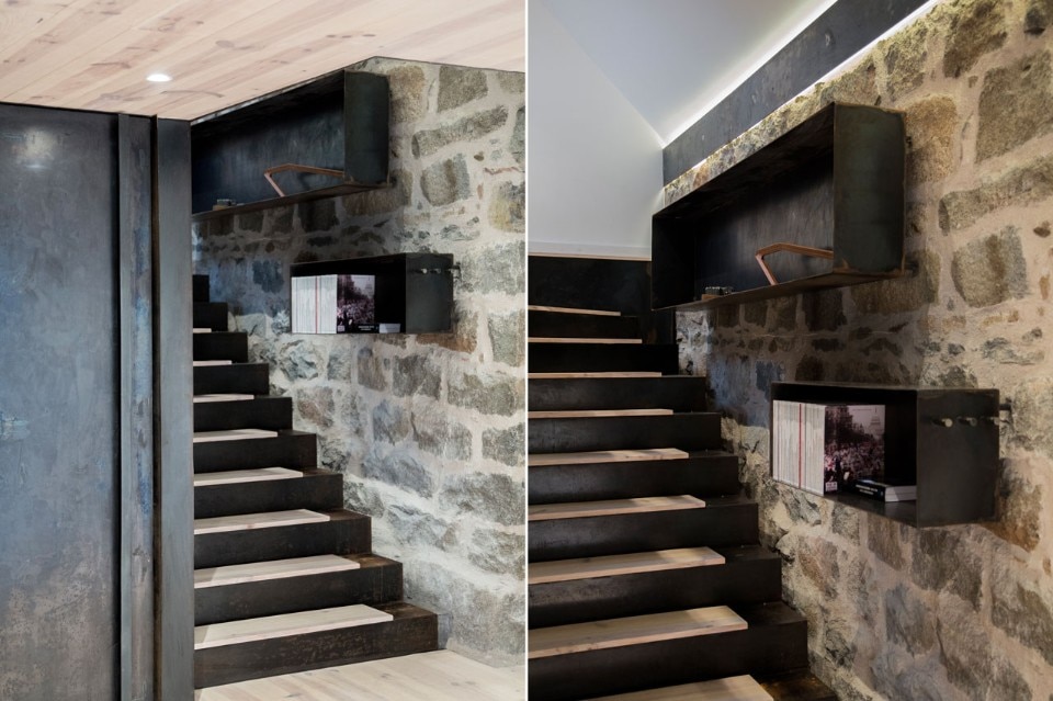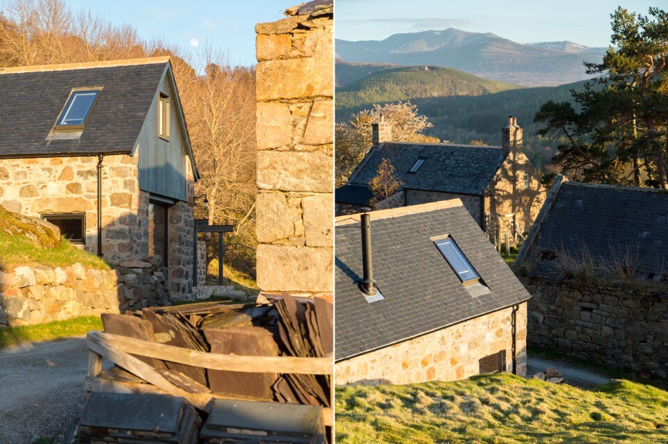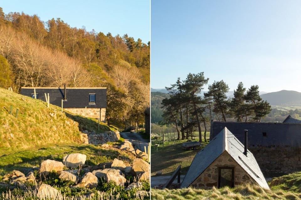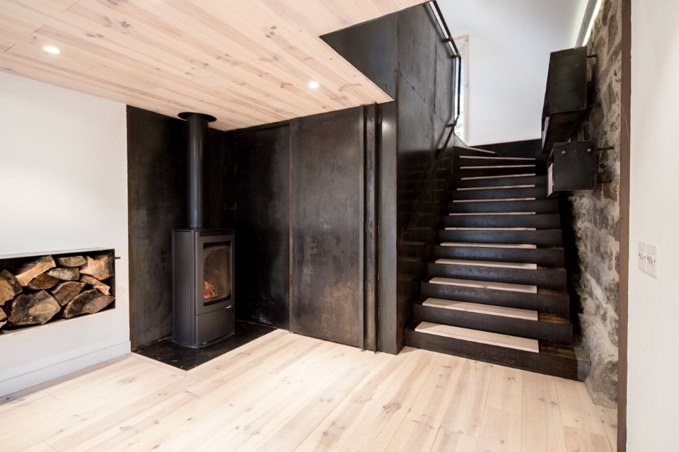 L’aggiunta di una stufa a legna serve come cenno alle tradizioni e alla cultura rurale, oltre che a fornire una fonte di calore negli inverni freddissimi delle montagne scozzesi. Lo studio incorpora un blocco di acciaio, che è un piccolo edificio dentro la struttura. L’innesto contiene la cucina, il magazzino e il bagno.