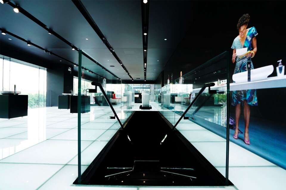 La superficie multimediale serve a dare agli spettatori vibranti e vividi scorci di realtà, sfidando i loro sensi e creando un atmosfera che è un mix fluido di persone, luci e movimenti. Il contenuto degli schermi, come le rappresentazioni di persone che utilizzano lo spazio, appartentemente ignari dell’esistenza di altri osservatori, sono visibili dalla strada. Chi attraversa la galleria percepisce un’intenzionale ambiguità tra interno ed esterno, derivati dal movimento dei pedoni vicini e dalle sagome. Il movimento è ulteriormente distorto dagli schermi a LED.