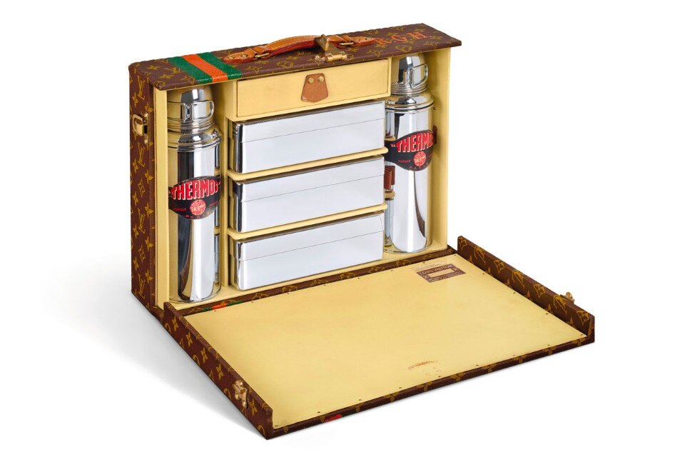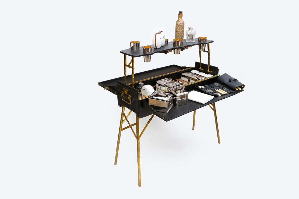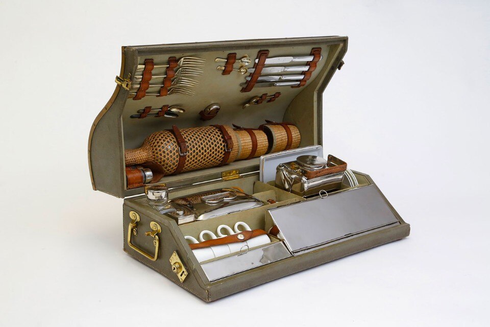 Kit da picnic con tavolo pieghevole per 6 persone, circa 1910. Legno, porcellana e metallo smaltato, argento e vetro. Collezione Axel Planmbeck, Zurigo. Foto Uwe Dettmar. © Museum Angewandte Kunst