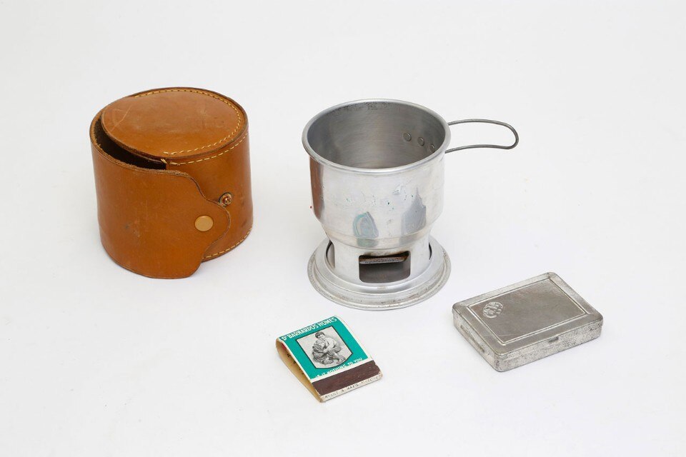 Meta cooker set consisting of flame, cup, tin with meta tablets, matches; Switzerland, 1940-1960. Alpines Museum der Schweiz, Bern, Photo: Uwe Dettmar, © Museum Angewandte Kunst