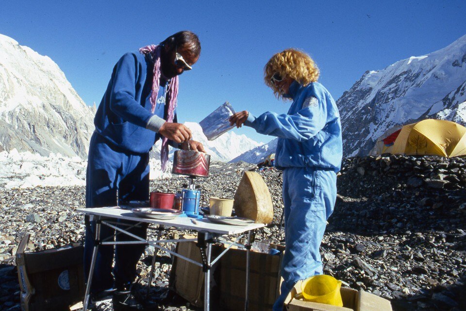 Jean Troillet e Nicole Niquille preparano una fonduta una fonduta durante la spedizione sul K2, Pakistan, 1985. © Alpines Museum der Schweiz, Berna
