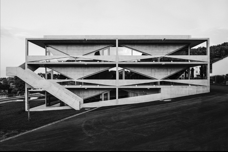 In apertura: Pier Luigi Nervi, Ambasciata Italiana a Brasilia. Foto Mario Carrieri. Qui sopra: Angela Deuber, Edificio scolastico a Thal, Austria. Foto Schaub Stierli Fotografie
