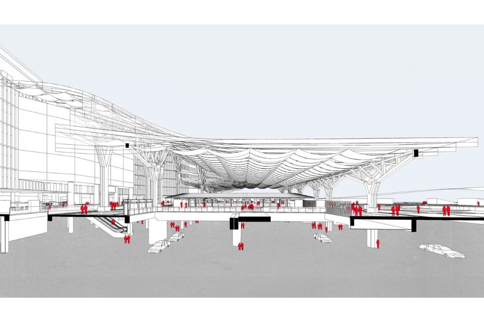 Architectural design and Research Institute of SCUT, Piazza pubblica e servizi per i passeggeri per la stazione dei treni di Guangzhou Est, esploso assonometrico