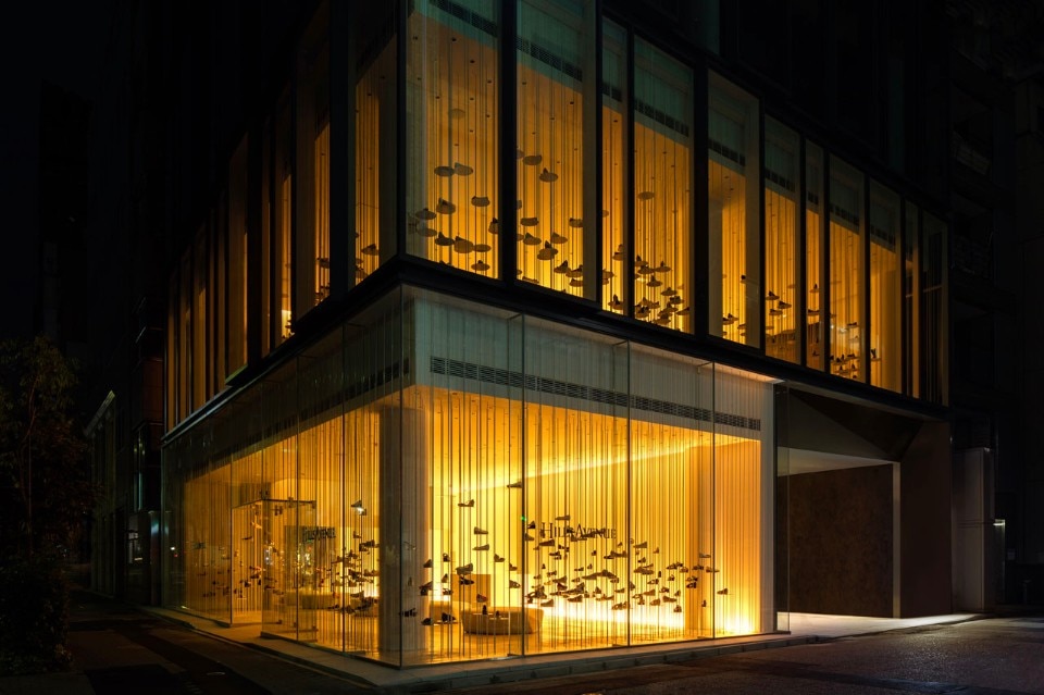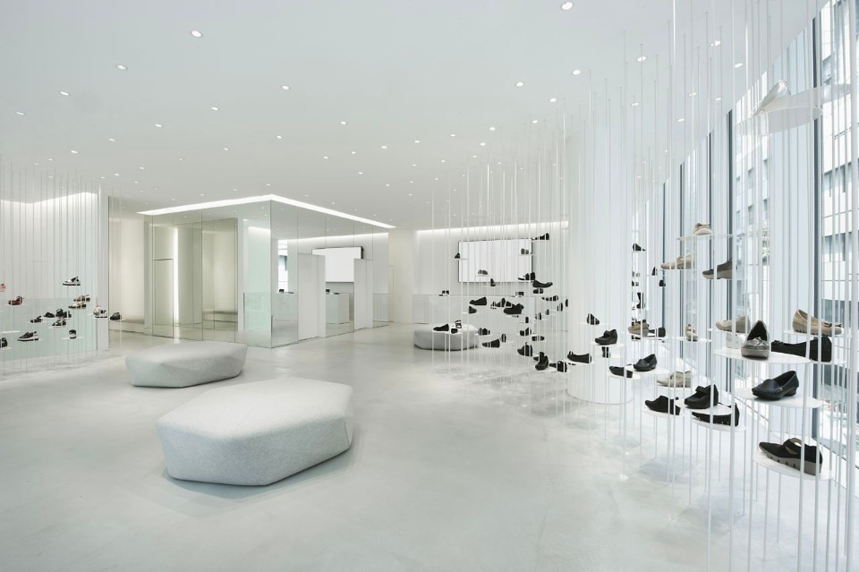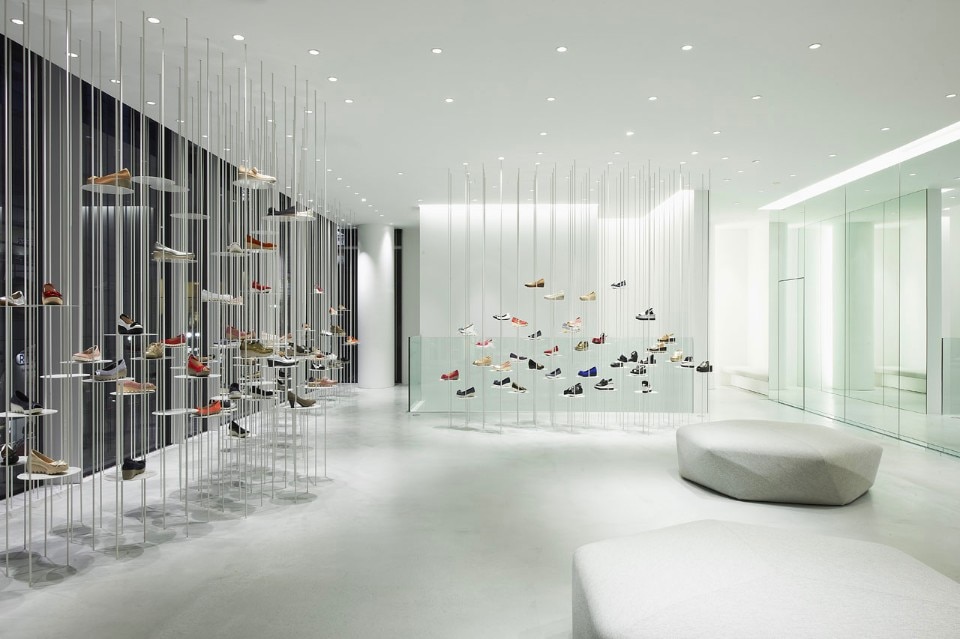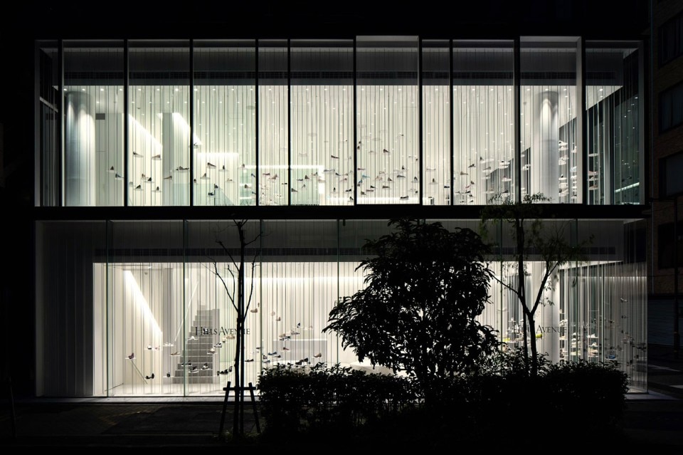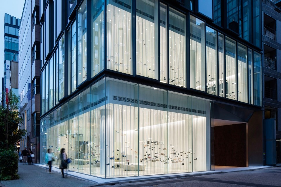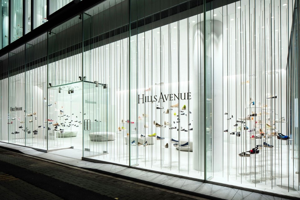 Lavorando con il tema del galleggiare, l’allestimento esprime la leggerezza delle scarpe brevettate da Hills Avenue. Contrariamente agli schemi abituali pieni di mensole, le scarpe di Tokujin fluttuano nell’aria. Il negozio è stato progettato in uno spazio di 300 mq, con 700 asticelle di acciaio bianco sottile che richiamano una foresta di alberi. Le scarpe sono posizionate su 500 dischi inseriti casualmente tra un’asta e l’altra. Durante il giorno lo spazio si riempie di luce naturale, mentre la sera è inondato di una calda luce gialla che rappresenta il tramonto.