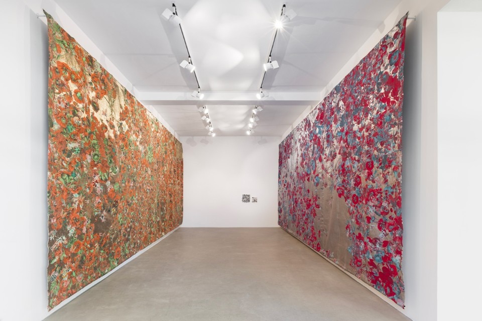 Il lavoro di Pae White si avvale di tecnologie avanzate, così come della collaborazione di esperti artigiani, con l’obiettivo di enfatizzare i limiti e le complessità di entrambi gli ambiti, e di scardinare la linea di confine tra funzionale e decorativo. I nuovi monumentali arazzi sono intessuti digitalmente e ricordano dei fondali di scena, alludendo all’aspetto intrinsecamente teatrale dell’esistenza.