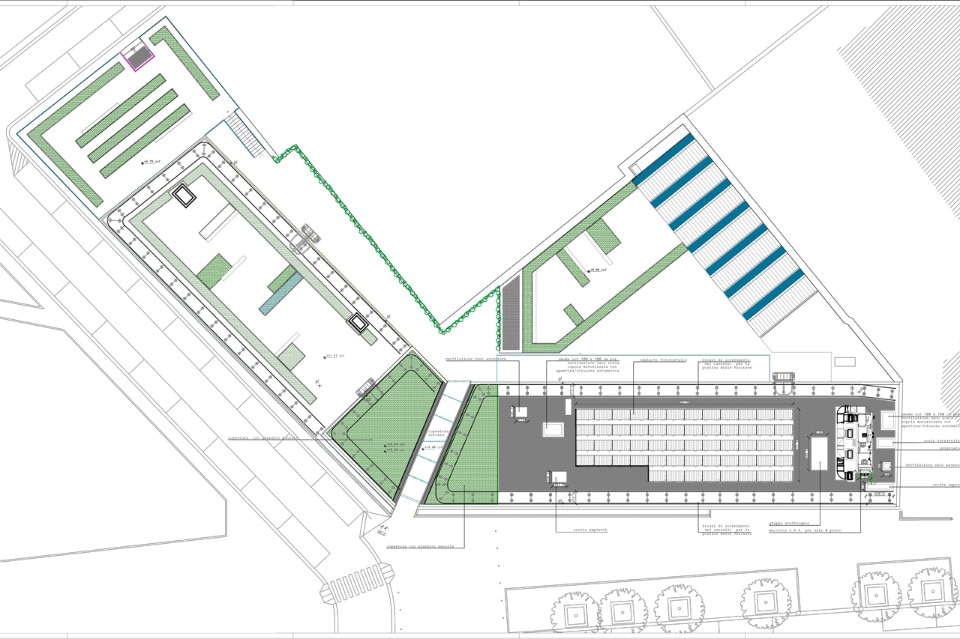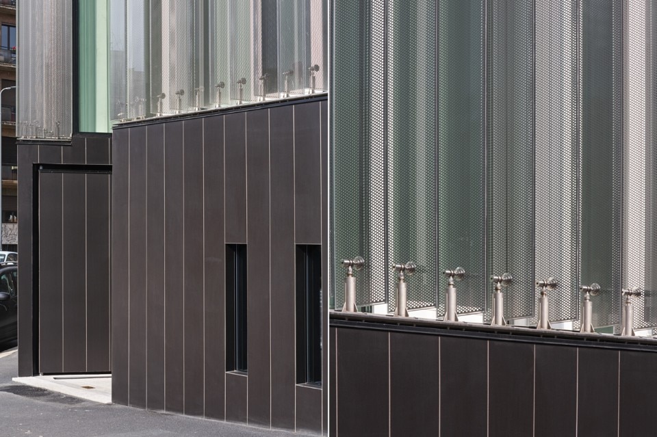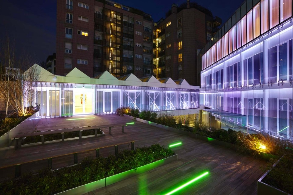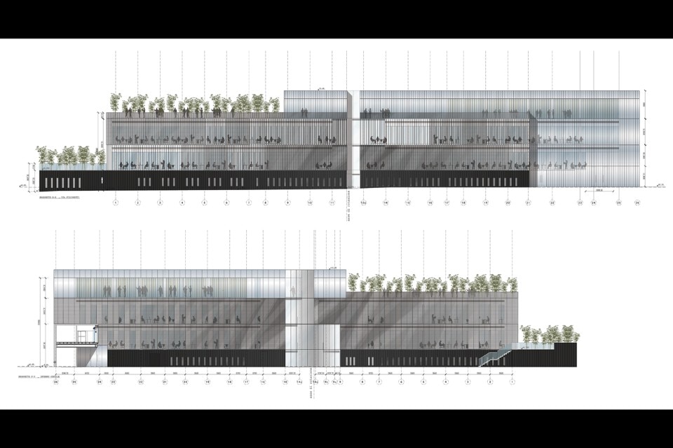 Sui primi due livelli dell’edificio trovano sistemazione gli ambienti di lavoro del centro assistenza, mentre l’ultimo piano, dotato di elementi frangisole interni rivestiti in legno, ospita una mensa e una sala riunioni. Nel cortile è stata allestita una scuola di formazione per venti studenti. Il reparto logistica e magazzino dell’edificio si trovano nel seminterrato posto su due livelli. Un “taglio” netto nella struttura, in corrispondenza dell’angolo formato dall’incontro delle due vie, crea un luminoso atrio a tripla altezza. Il progetto strutturale, con le colonne portanti interposte tra le facciate in vetro a doppia pelle, fa sì che i piani occupati dal centro assistenza e dalle sale riunioni siano privi di pilastri, per consentire, se del caso, un’agevole riconfigurazione degli spazi lavorativi.