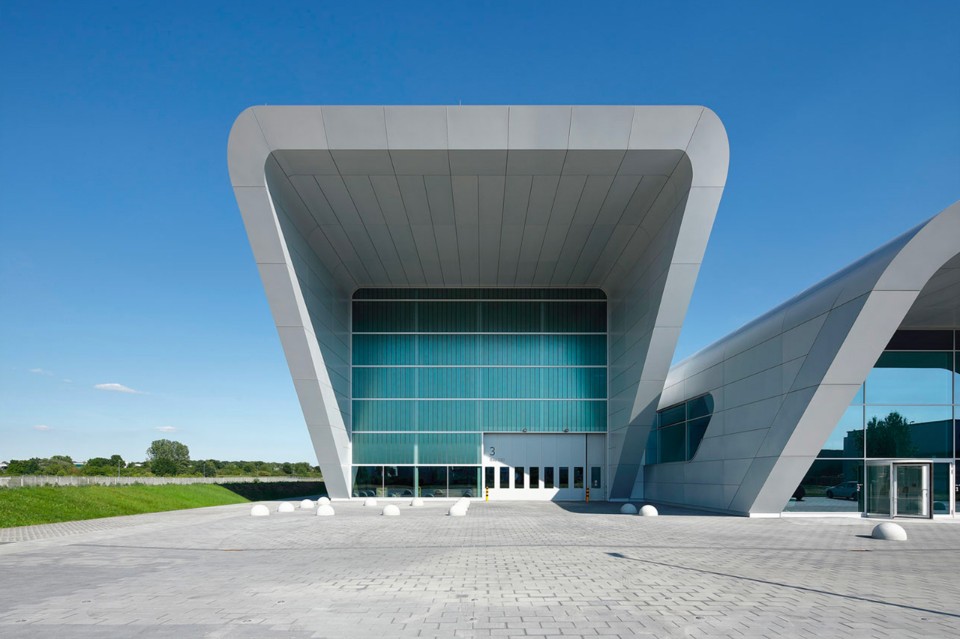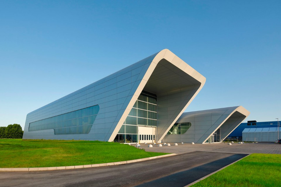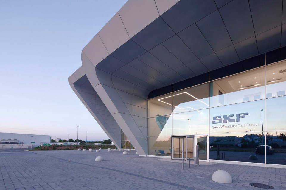 Entrambi i volumi, situati in un terreno di 14 ettari, sono costruzioni massicce, con una struttura a telaio e la fondazione di cemento armato. Le facciate sono rivestite con pannelli di alluminio bianco riflettente. Ogni volume ha una sua funzione. Nell’edificio maggiore si trovano due centri di prova per cuscinetti di grandi dimensione e altri due spazi per i test, collocati in spazi al primo piano. Una gru che può sollevare fino a 110 tonnellate garantisce lo spostamento di componenti meccanici altamente sensibili.