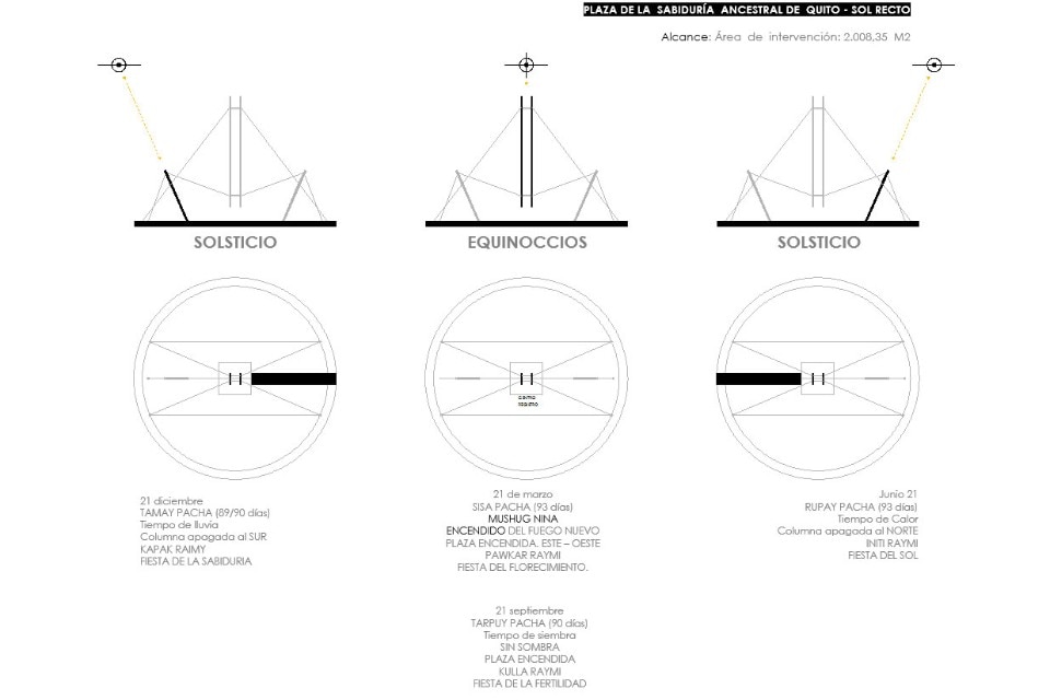 L’installazione rappresenta anche uno strumento simbolico per la tradizione andina, ovvero l’orologio solare, che serviva a determinare equinozi e solstizi. Quito Sol Recto ha un’altezza di 25 m ed è sollevata da terra 3,5 m. La tensostruttura pesa in totale 7,5 tonnellate.