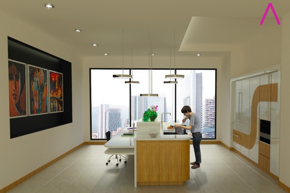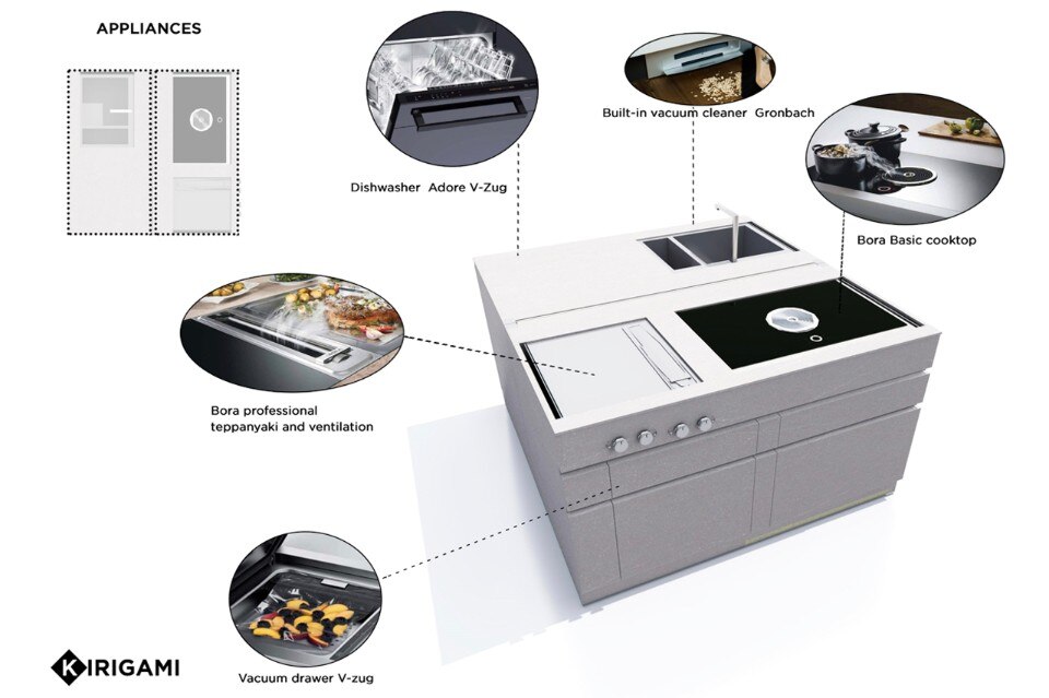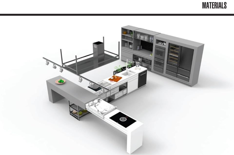 Gli studenti hanno individuato quattro diverse tipologie di utenti per altrettanti progetti di cucine: quella per un freelance, una food blogger, una famiglia con bambini, due artisti. Le docenti Venere Ferraro e Silvia Ferraris hanno fissato come obiettivo agli studenti quello di progettare tutta l’esperienza attorno all’ambiente cucina: capire ed esaltare le potenzialità dei prodotti, conoscere i trend attuali, assecondare i bisogni degli utenti. Il primo progetto presentato alla giuria è Kirigami (kitchen origami), ideato da Alberto Talarico, Hamid Al Busaidi, Gursimran Maini. Una cucina per due artisti dinamici, irriverenti, esuberanti che vivono in libertà uno spazio calibrato attorno al rettangolo aureo. Le superfici si svolgono e piegano, si muovono e modulano come un origami per far vivere un’esperienza versatile esattamente come la vita dei suoi fruitori. In Kirigami cucinare e mangiare sono un’attività sociale, ma anche creativa.