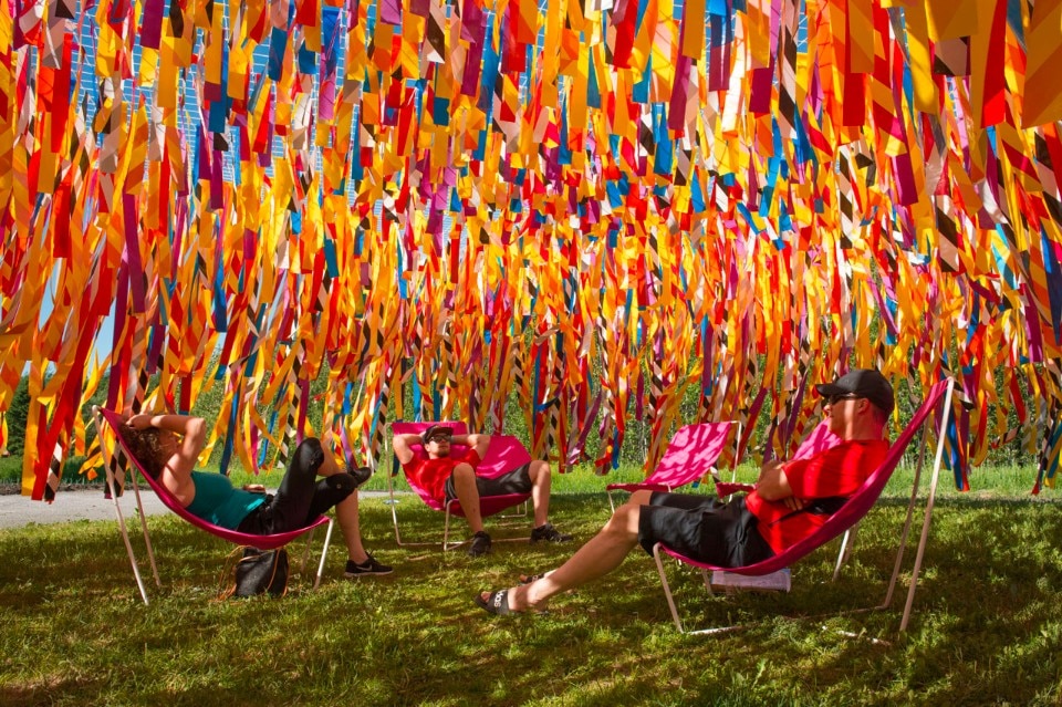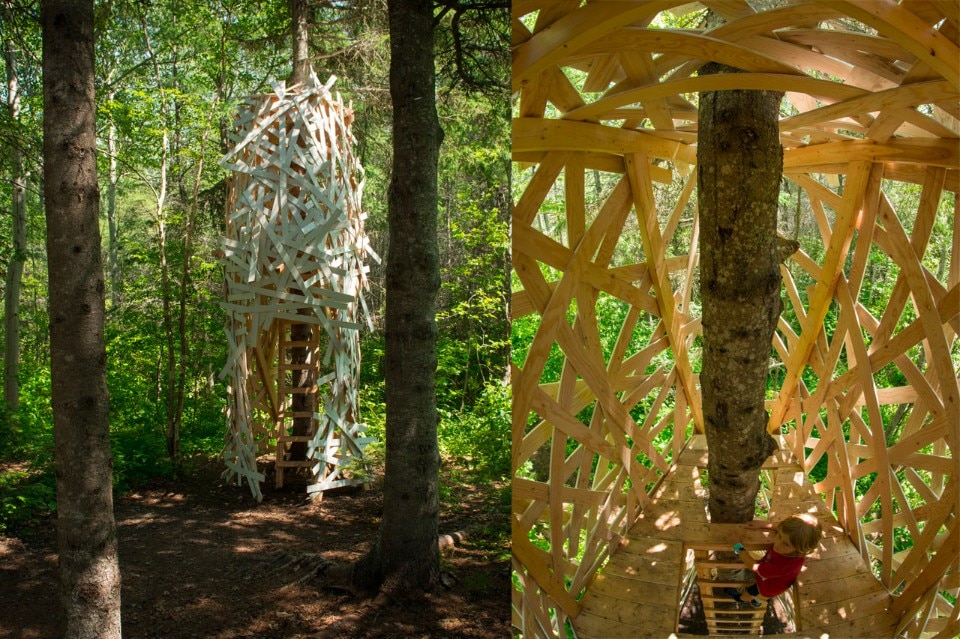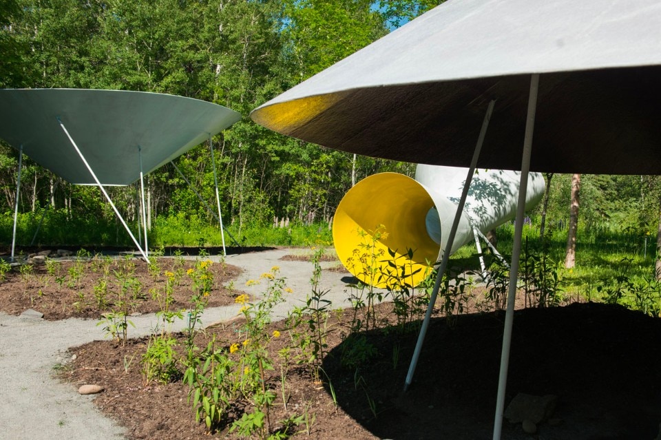 Piccole porzioni di terreno su ruote, carri per bambini, sono a disposizione per essere scelti, adottati e trasportati all’interno dell’installazione L’Escale di Collectif Escargo (Pierre-Yves Diehl, designer, Karyna St-Pierre, architetta paesaggista e Julie Parenteau, insegnante d’arte –Montréal). Nel Woodstock di Atelier YokYok (Steven Fuhrman, Samson Lacoste & Luc Pinsard, architetti, Laure K, insegnante, e Pauline Lazareff, ingegnere architetto – Parigi), uno strano parco giochi cresce tra gli alberi e forma uno spazio di gioco dove i bambini diventano giganti. La Chrysalide degli architetti del paesaggio Gabriel Lacombe e Virginie Roy-Mazoyer – di Vancouver e Montréal – è un invito a fare una pausa nel tempo, tra l’infanzia e l’età adulta, per salire sull’albero, creare un nido e sdraiarsi a sognare.