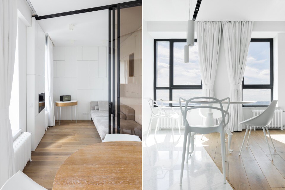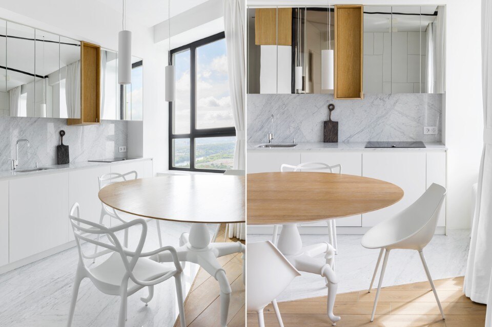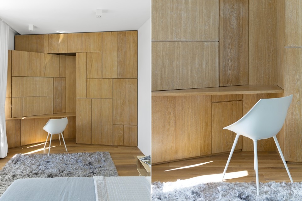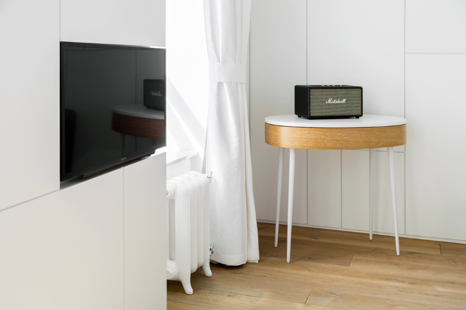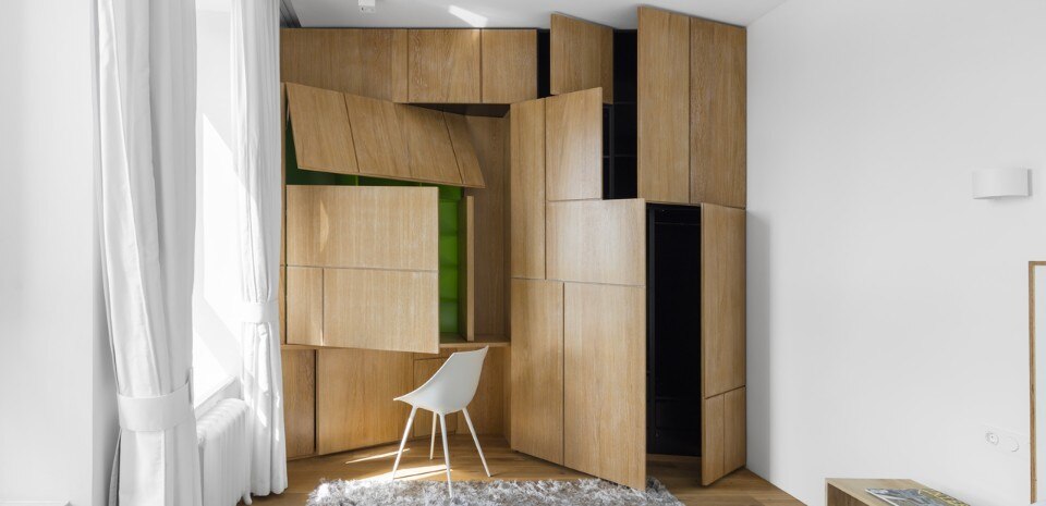 Lo stile dell’interno può essere descritto come minimalismo funzionale. Tutti i mobili sono chiaramente legati alla geometria dello spazio e creano un interno unitario, funzionale ai diversi usi del quotidiano e capace di trasformarsi a seconda delle necessità. Tutti i mobili sono stati progettati dallo studio russo e sono realizzati da artigiani locali. Quindi, per esempio, la partizione creata per il soggiorno è un armadio accessibile da entrambe i lati. La parte superiore è utilizzabile dalla parte della zona giorno, mentre il lato opposto, verso il corridoio, è apribile nella sua parte inferiore.