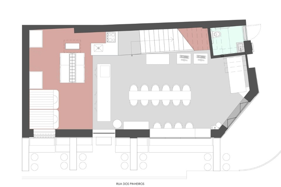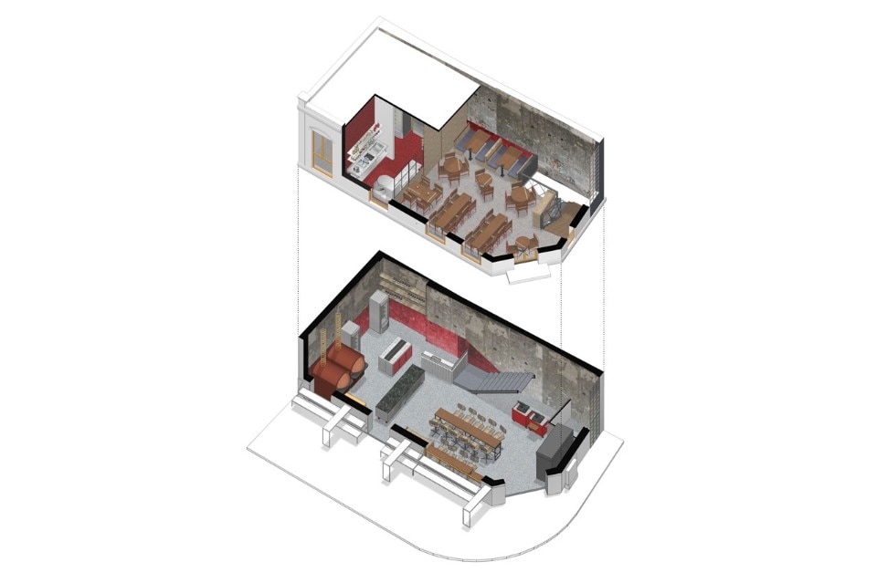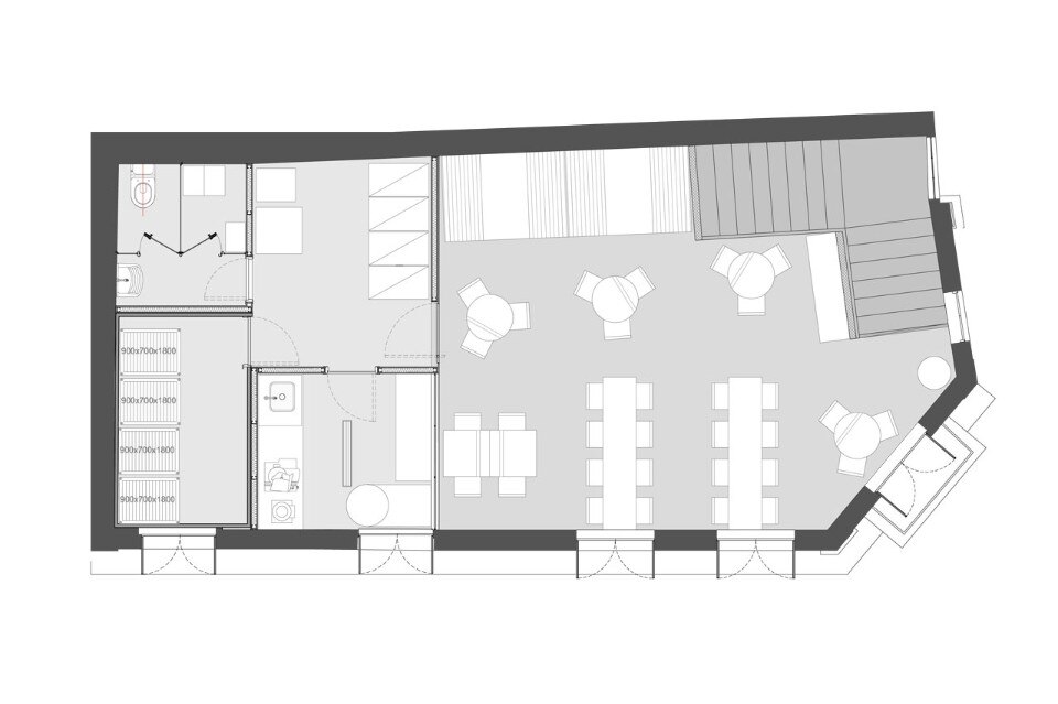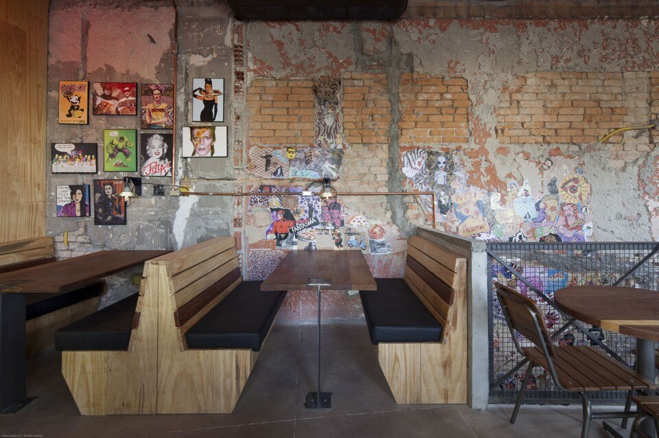 Mobilità, praticità e funzionalità sono i tre elementi chiave del design d’interni. Il forno italiano è stato ordinato con ruote incorporate per agevolarne lo spostamento, così come i frigoriferi, banconi e gli elementi modulari. Il progetto ha optato per una disposizione che ottimizzasse i flussi: una volta entrati, i clienti possono ordinare direttamente al bancone d’ingresso. L’utilizzo di metalli diversi allude ai materiali conduttori, mentre nella zona di preparazione è stata usata una pietra bianca appositamente richiesta dai pizzaioli per impastare al meglio.