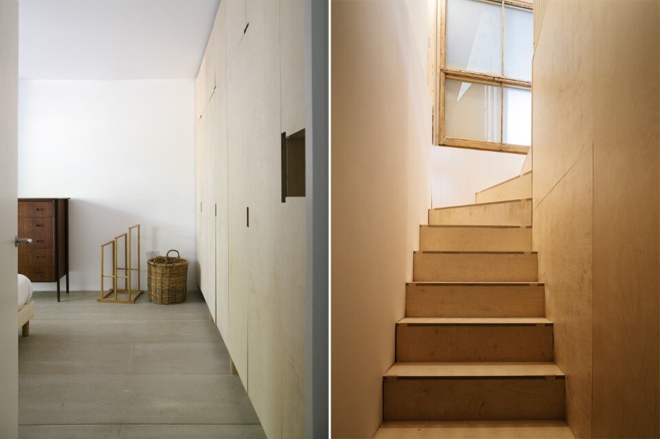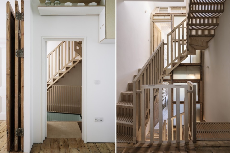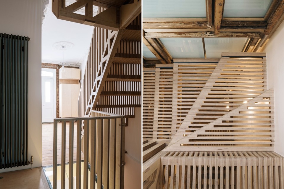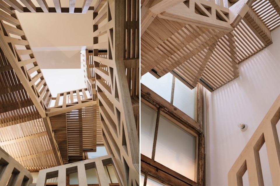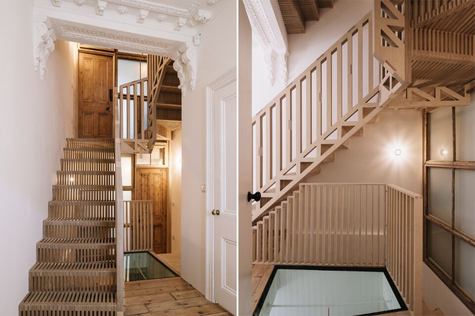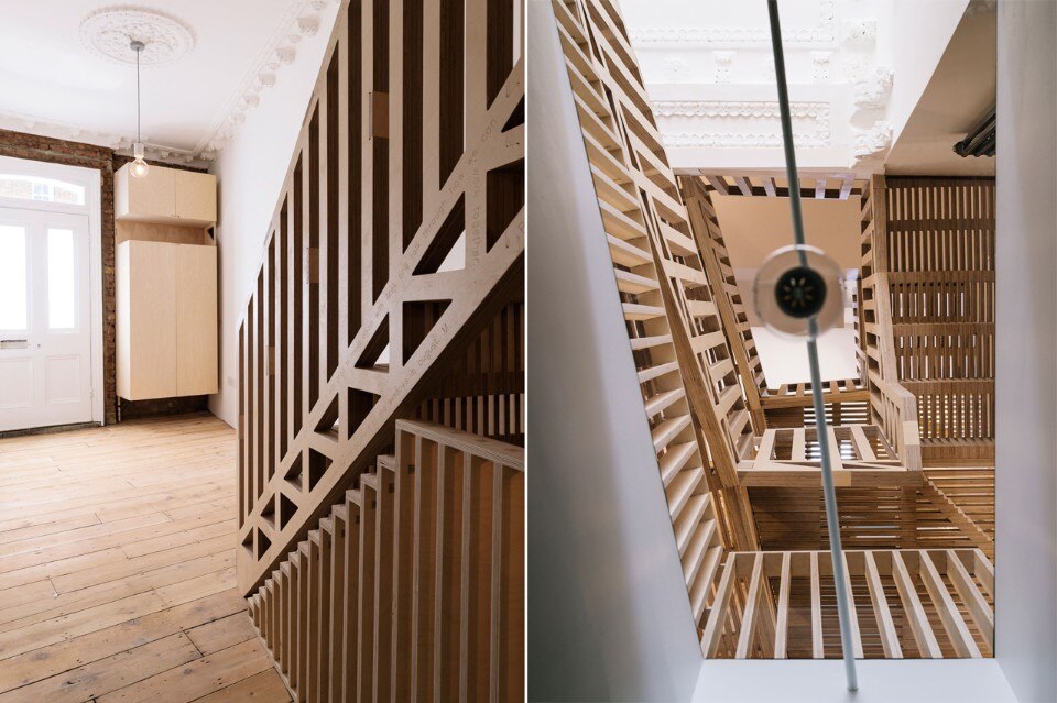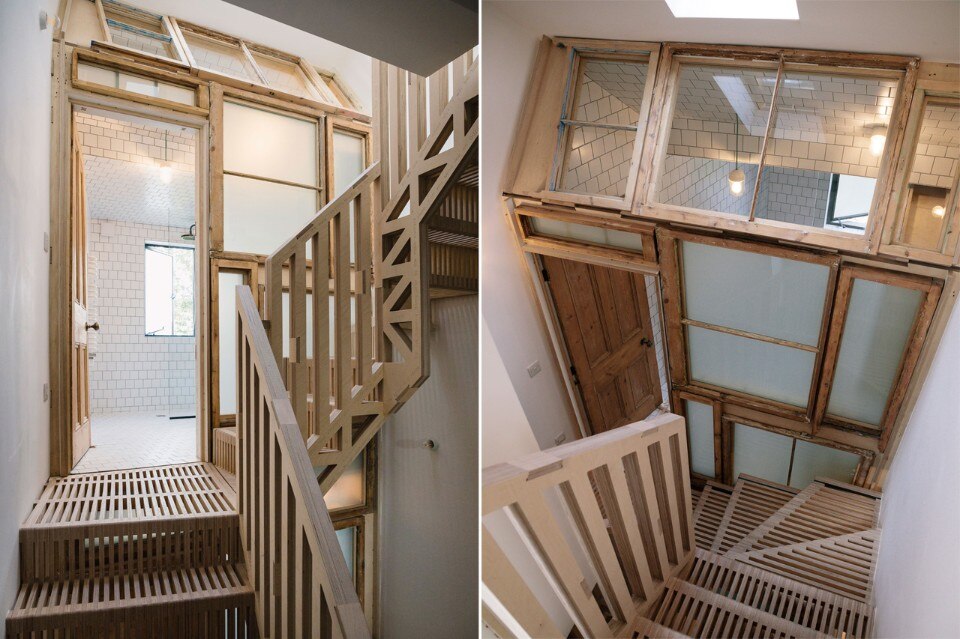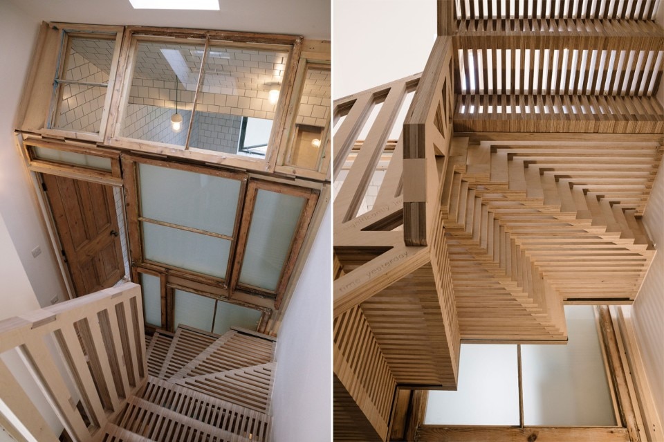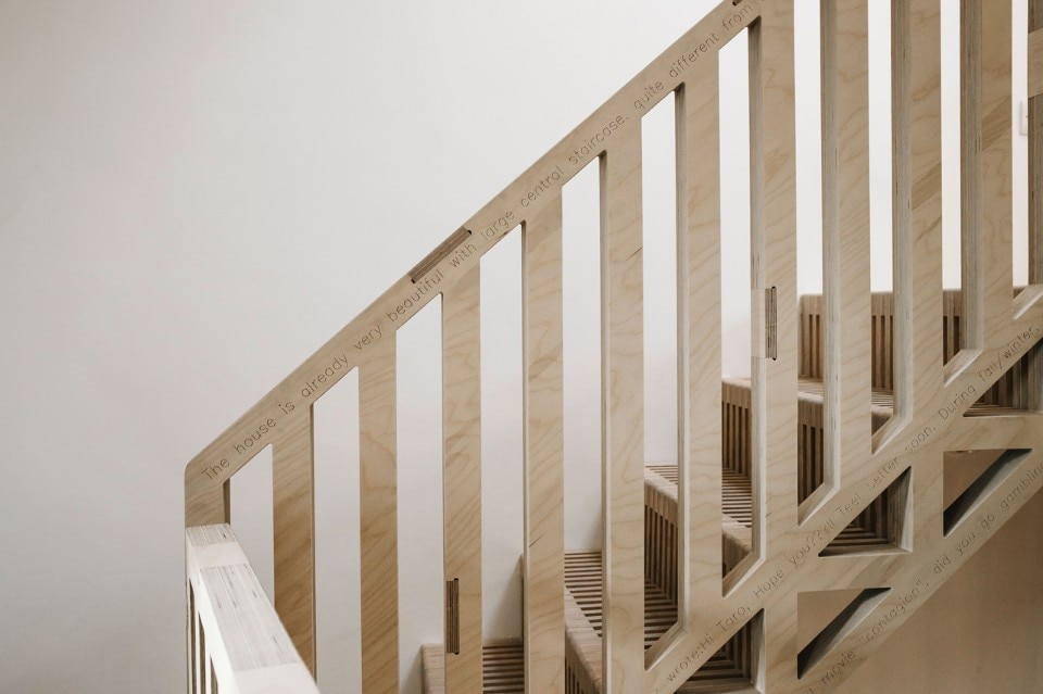 La struttura di legno perforata e la ringhiera della nuova scalinata lasciano passare luce e aria in una configurazione più compatta. Tracce di dialoghi e di scambi di e-mail tra il cliente e l’architetto sono stati incisi sul corrimano, suggerendo una scala supportata da un pizzico di contemporaneità.