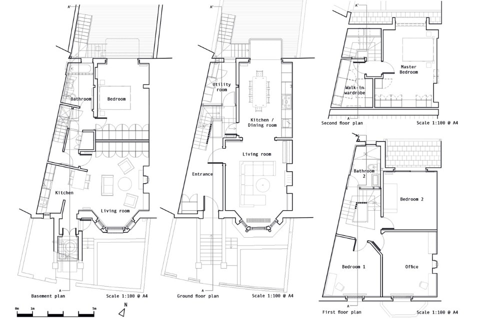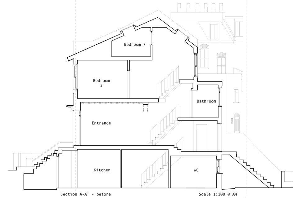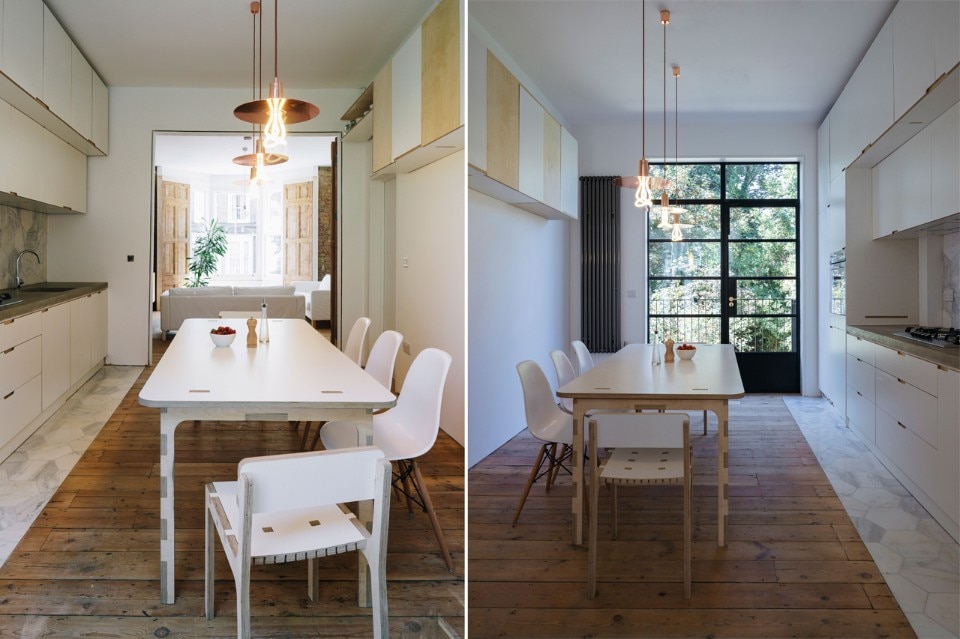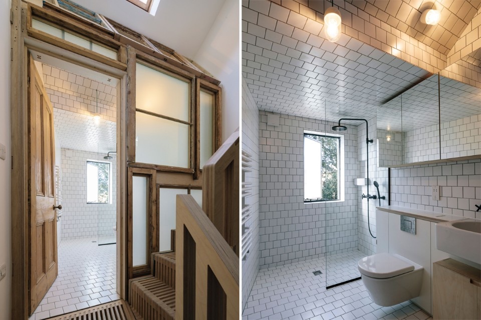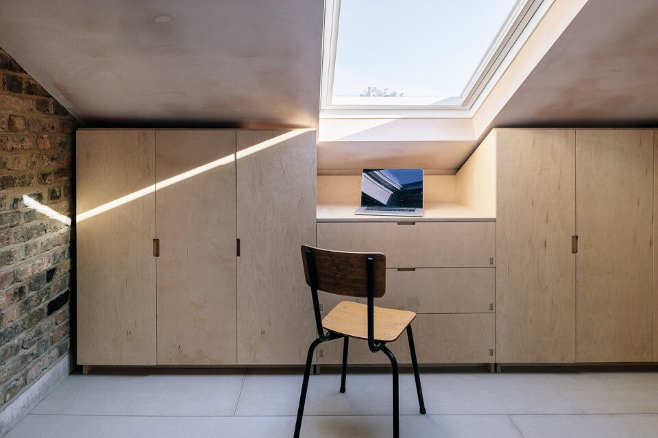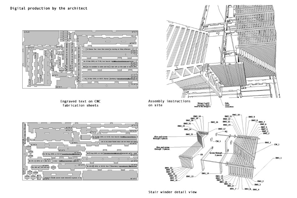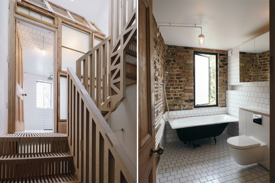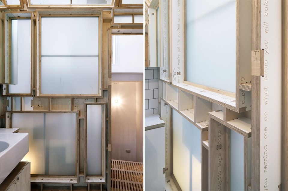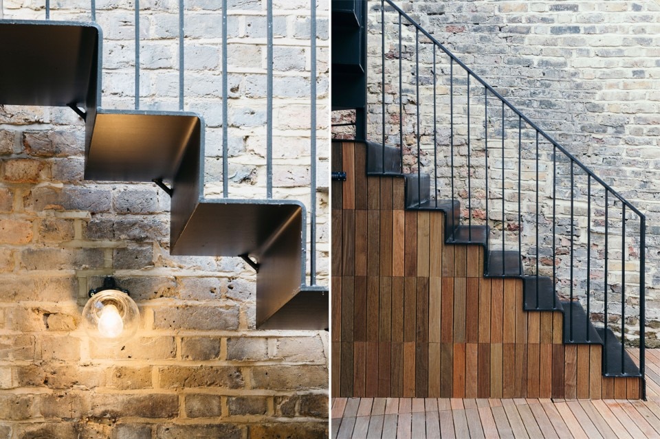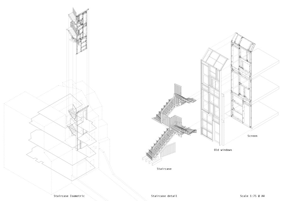 La struttura di legno perforata e la ringhiera della nuova scalinata lasciano passare luce e aria in una configurazione più compatta. Tracce di dialoghi e di scambi di e-mail tra il cliente e l’architetto sono stati incisi sul corrimano, suggerendo una scala supportata da un pizzico di contemporaneità.
