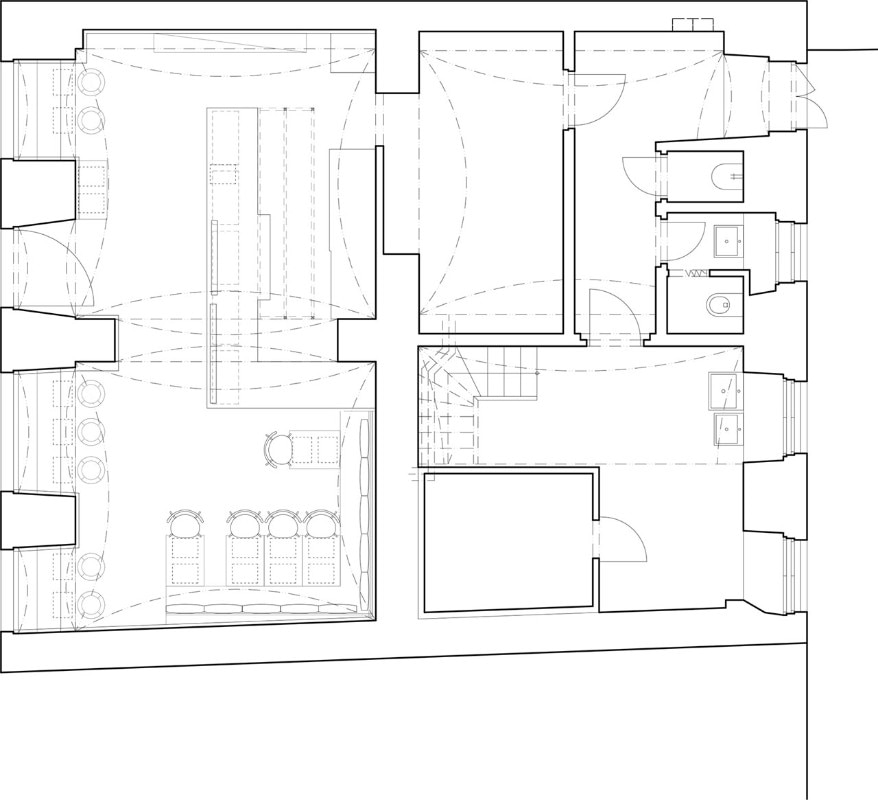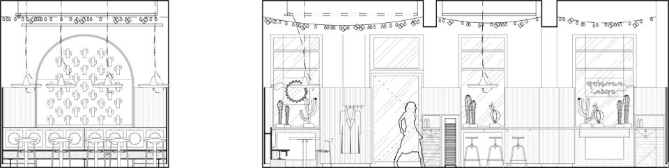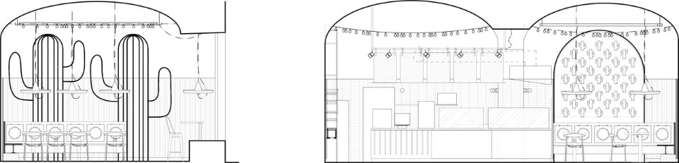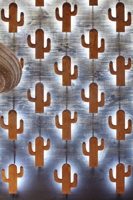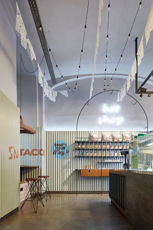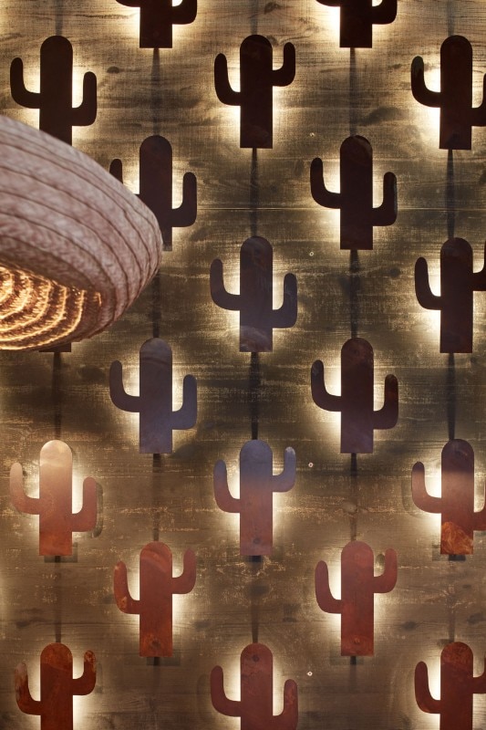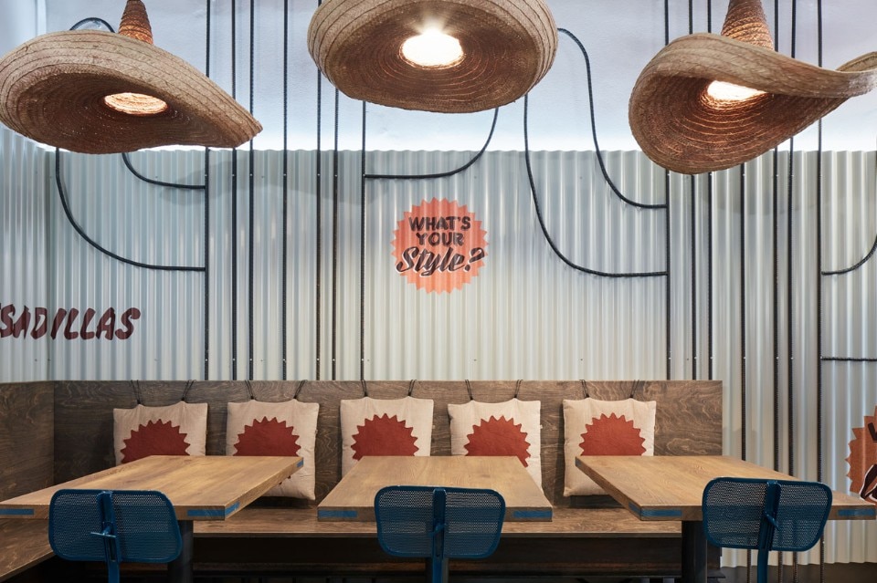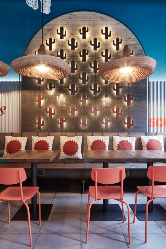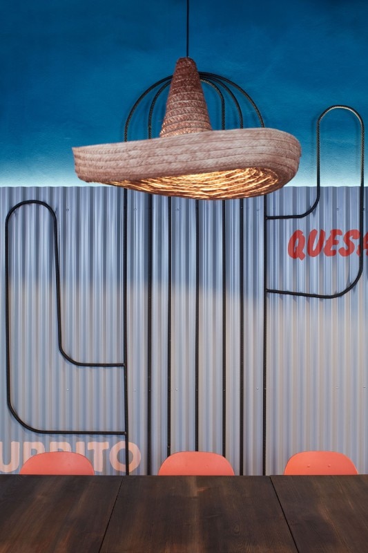 Formafatal ha intenzionalmente sostituito le classiche piastrelle messicane con delle varianti monocrome, e ha installato alcuni oggetti-simbolo della cultura pop messicana, come i cactus e le ghirlande di carta appese. Il sole stilizzato del logo di Burrito Loco è stapato su cuscini, pareti e vetrate. I bagni sono essenziali e tinteggiati con lo stesso rosa salmone e blu petrolio delle pareti del ristorante.
