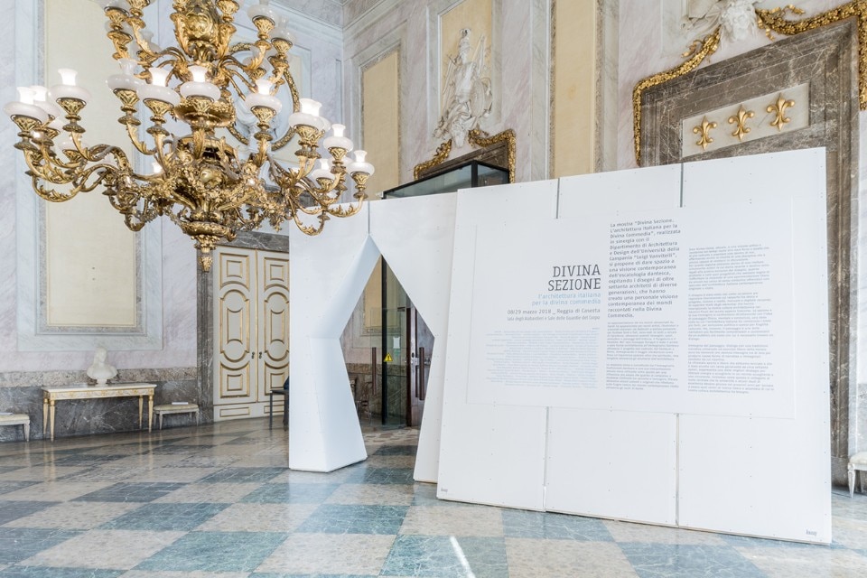 Ha inaugurato l’8 marzo 2018 la mostra “Divina Sezione. L’architettura italiana per la Divina Commedia” nella cornice storica della Reggia di Caserta. I curatori Luca Molinari e Chiara Ingrosso, parte del Dipartimento di Architettura e Disegno Industriale Luigi Vanvitelli, hanno proposto agli autori invitati di trasporre in disegno l’opera dantesca come occasione per trattare del complesso rapporto fra narrazione e immagine.