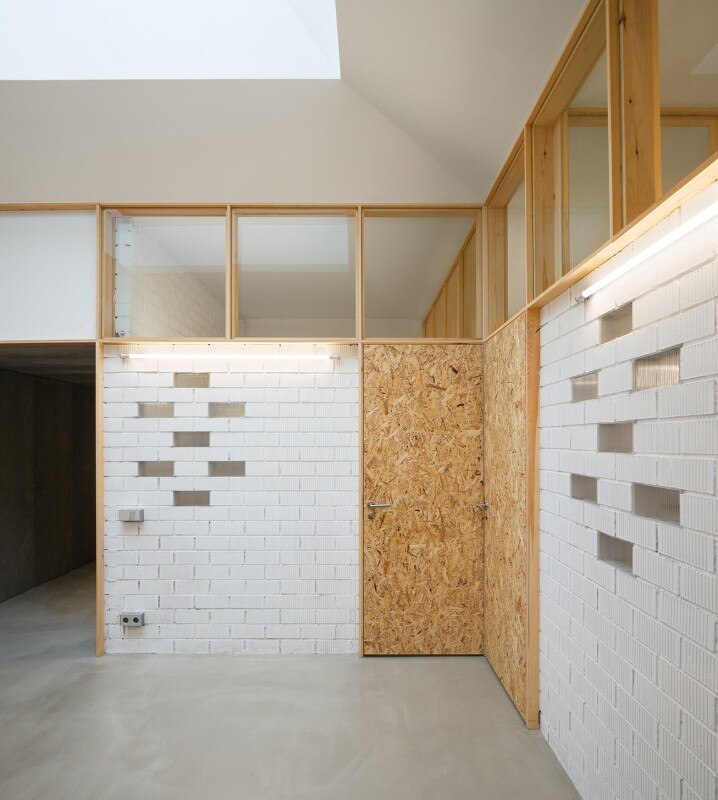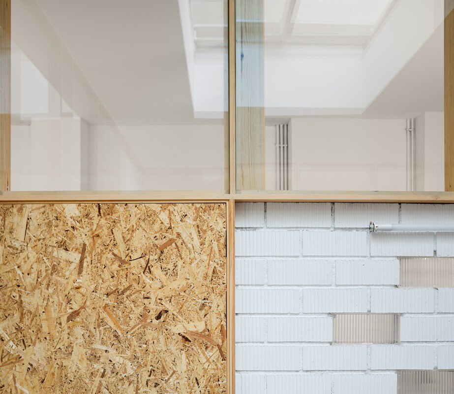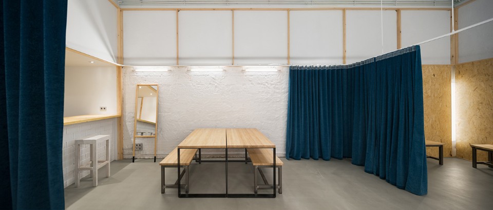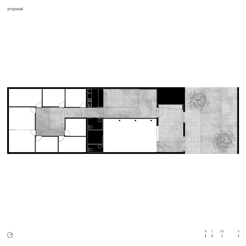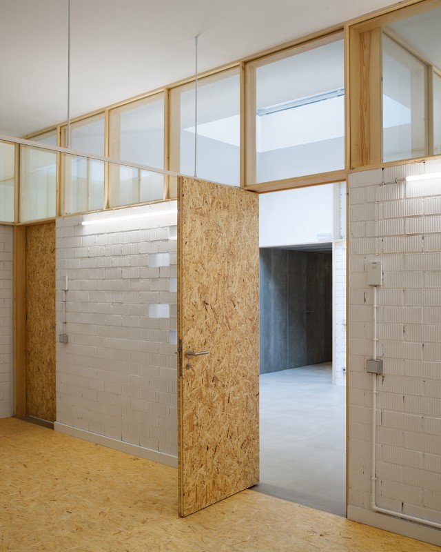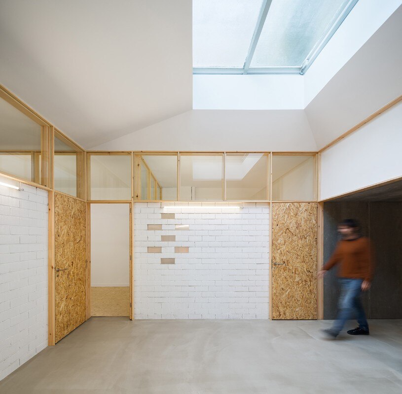 La strategia per la riprogettazione degli interni è consistita nella divisione in quattro spazi concatenati che formano una sequenza. La prima area è concepita come una zona di transizione sul fronte stradale, la seconda è uno spazio aperto utilizzato per attività di gruppo, mentre la terza contiene servizi come cucina abitabile, servizi igienici e deposito. La quarta area è un'aggregazione di sette uffici che guardano verso l'interno, verso uno spazio centrale illuminato da un lucernario. L'intera strategia progettuale risponde alle esigenze funzionali, fornendo luminosità a questo spazio annidato nel tessuto urbano di Terrassa.