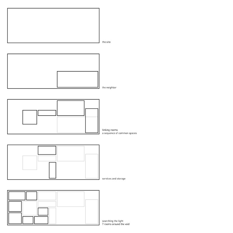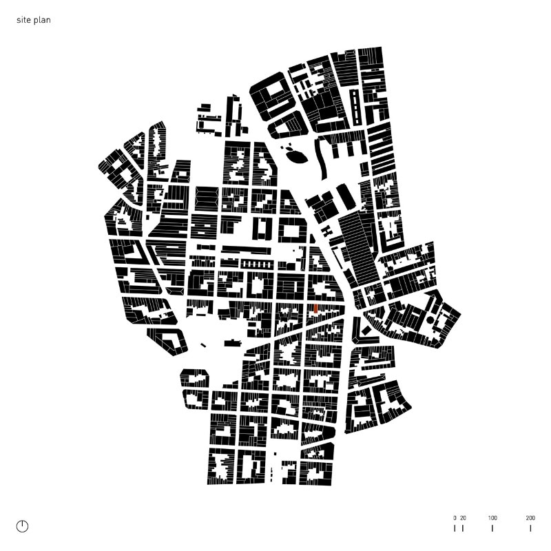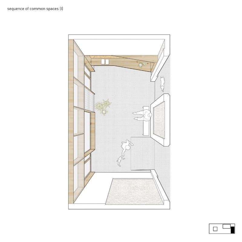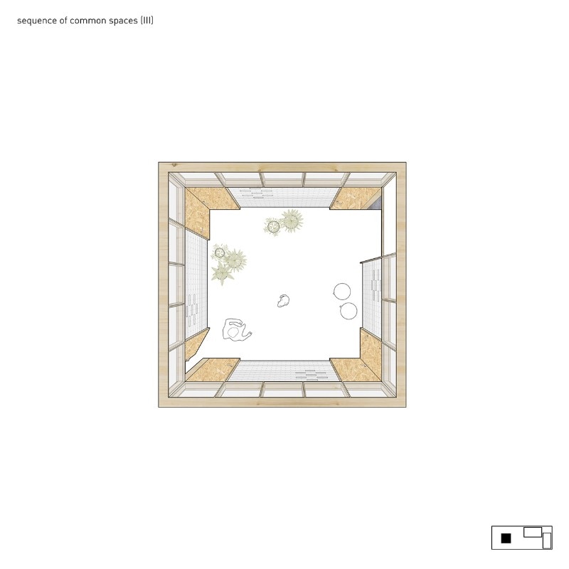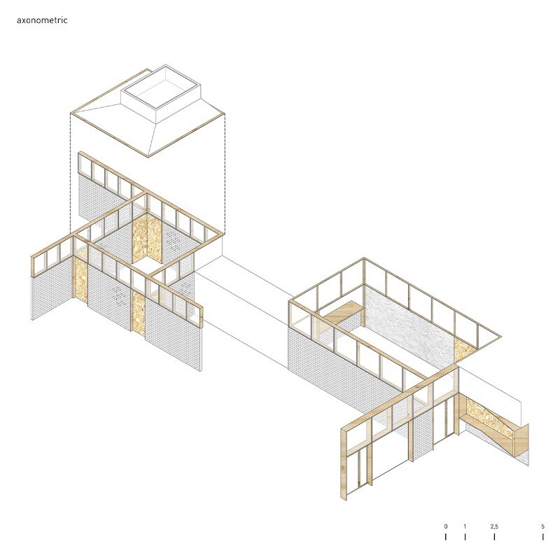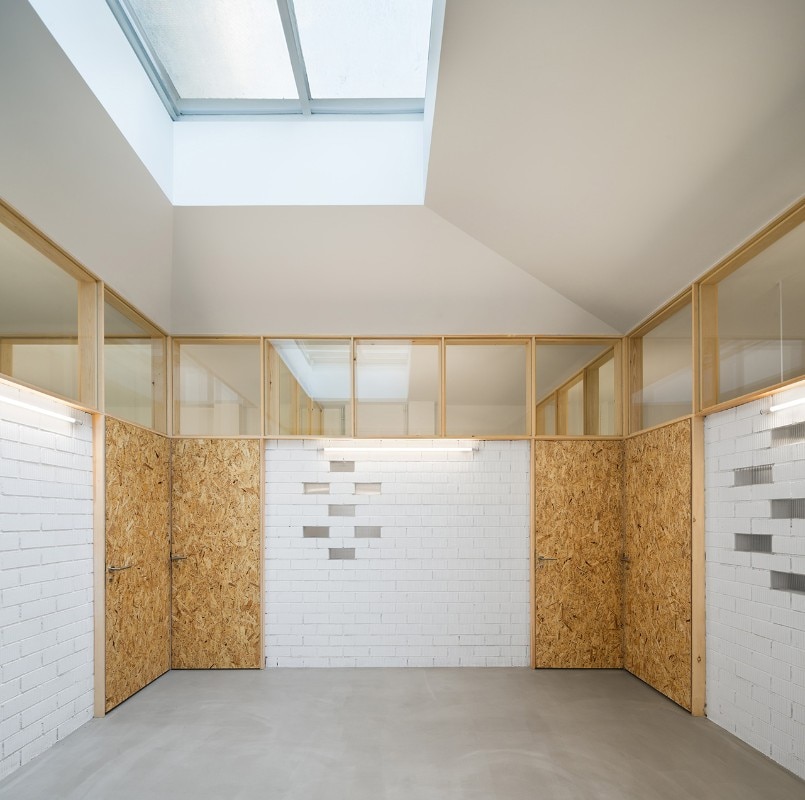 La strategia per la riprogettazione degli interni è consistita nella divisione in quattro spazi concatenati che formano una sequenza. La prima area è concepita come una zona di transizione sul fronte stradale, la seconda è uno spazio aperto utilizzato per attività di gruppo, mentre la terza contiene servizi come cucina abitabile, servizi igienici e deposito. La quarta area è un'aggregazione di sette uffici che guardano verso l'interno, verso uno spazio centrale illuminato da un lucernario. L'intera strategia progettuale risponde alle esigenze funzionali, fornendo luminosità a questo spazio annidato nel tessuto urbano di Terrassa.