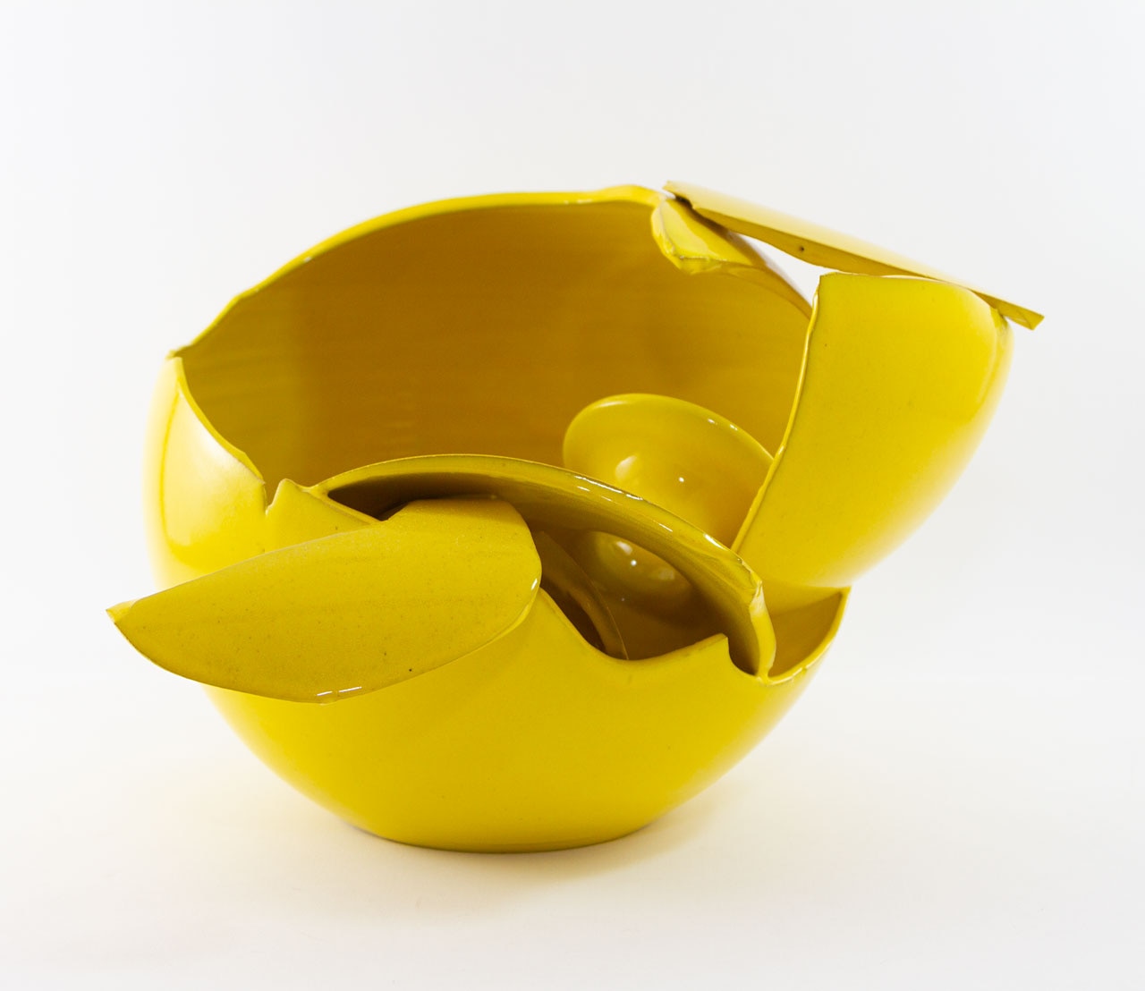 Andrea Anastasio smette qui i panni di designer – di Artemide, Memphis e Alchimia, tra gli altri – per rinnovare lo status di artista a tutto tondo che gli hanno sempre tributato personaggi illustri come Bruno Munari e Ettore Sottsass, suoi pigmalioni, o Antonia Jannone e Luisa Delle Piane, “padrone di casa” delle sue principali mostre. La manualità, così liberatoria ed energica nella manipolazione di una materia da intendersi filosoficamente come spirito vitale, rivela qui tutta la sua urgenza espressiva. I vasi in ceramica smaltata sono tutti rotti, ma di una rottura “perfetta”, armonica, quasi metafisica. Una sorta di bellezza deturpata, come ben spiegava Vito Mancuso nel suo Io e Dio ispirato a sua volta da Dostoevskij: “Non esiste bellezza che non sia attraversata da una dolorosa frattura”.