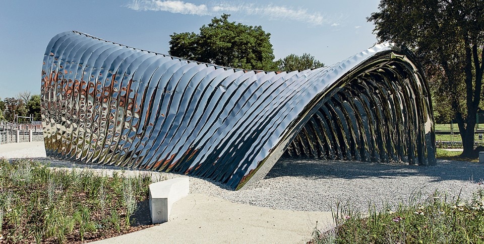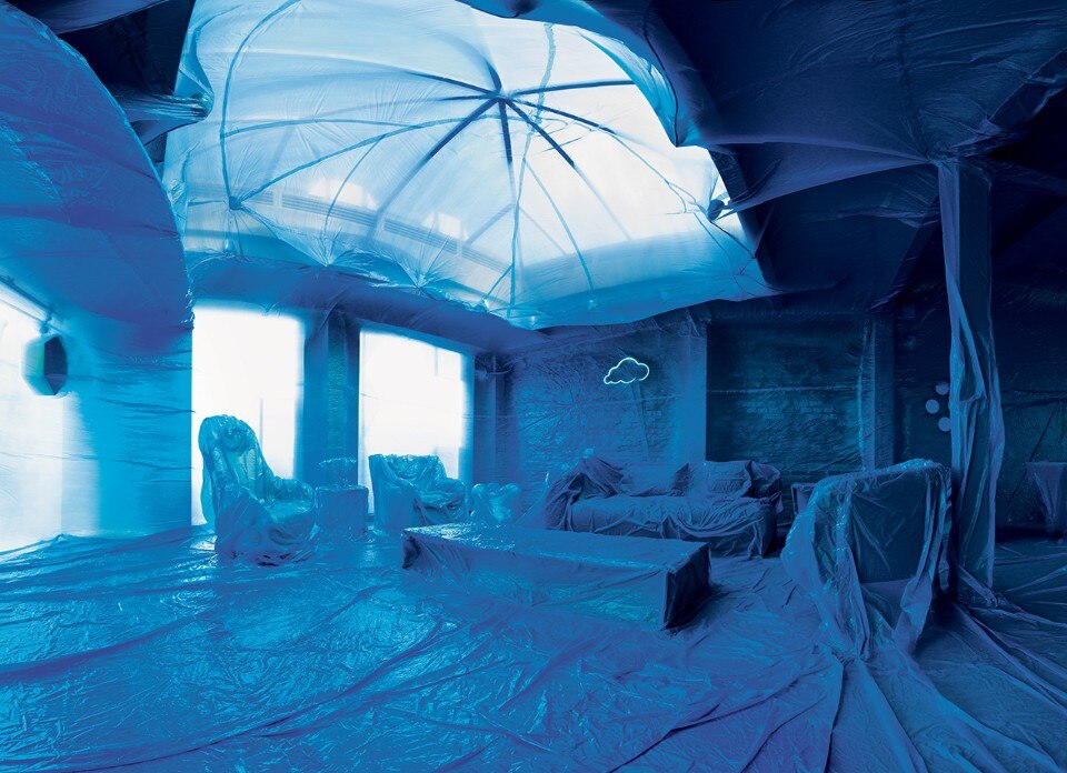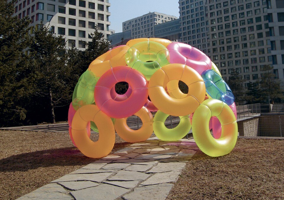 Virginia Melnyk (artista), Pechino, Cina, 2014. Questa leggerissima cupola geodetica è fatta di materassini gonfiabili a forma di ciambella, simbolo dell’estate per eccellenza. L’artista ha realizzato quest’opera nella speranza di creare uno spazio raccolto e riparato, ma allo stesso tempo divertente, all’interno di un’ampia area urbana, un modo per stimolare i visitatori a osservare i dintorni sotto una nuova luce.