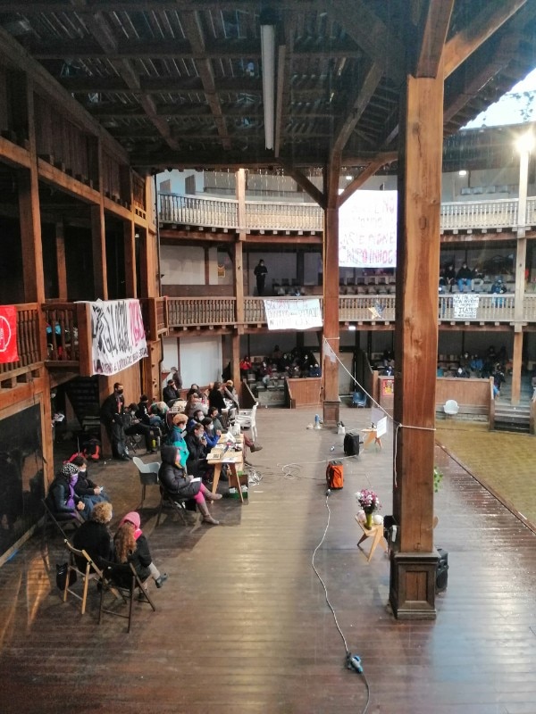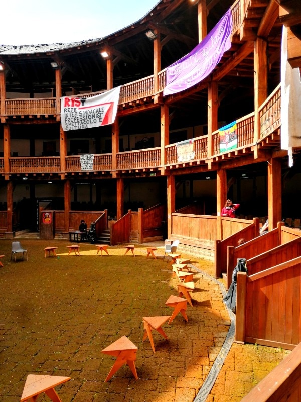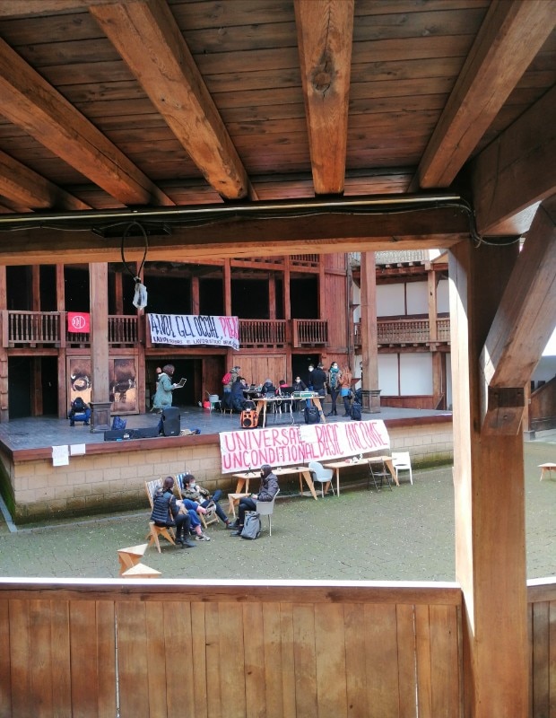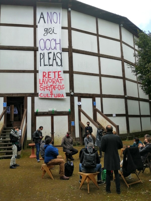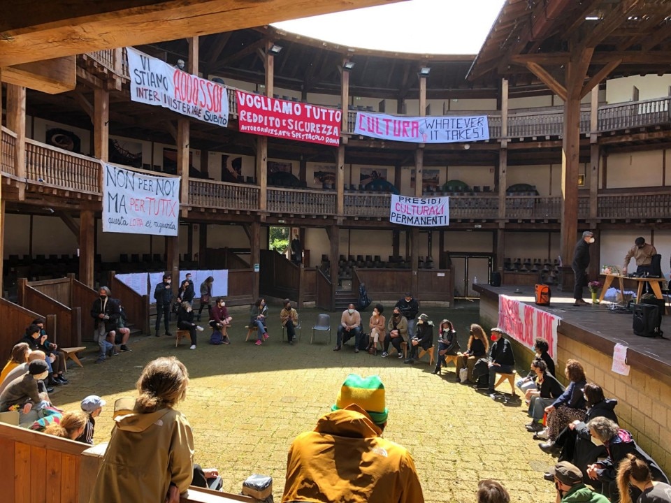 “Un paese che non investe nel proprio teatro o è morto o è moribondo”, “Istruitx, agitatx, organizzatx”, “Universal Unconditional Basic Income”, “A noi gli occhi, please”, e ancora “Non per noi, ma per tuttx. Questa lotta ci riguarda” e “L’arte non è un mondo a parte. L’arte non è un campo innocente”. Queste sono solo alcune delle frasi che scandivano la struttura lignea del Globe Theatre a Roma. Poetiche e potenti al contempo, sintesi di complesse rivendicazioni, alla base di un lungo anno di lotta da parte dei lavoratori e delle lavoratrici dello spettacolo, culminato nell’occupazione temporanea del teatro in stile elisabettiano immerso nel parco di Villa Borghese. Uno spazio scenico per lo più all’aperto che per 5 giorni – dal 14 al 18 aprile – è diventato piazza, luogo di incontro, dibattito e discussione per chiedere insieme una riforma strutturale del settore e non semplici misure di emergenza.