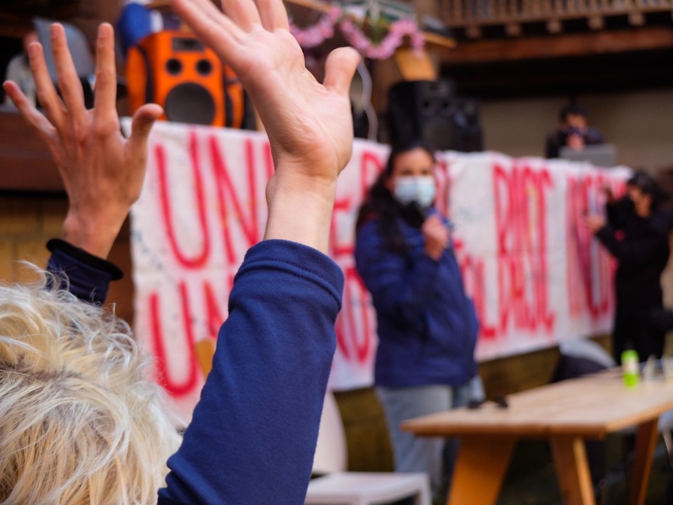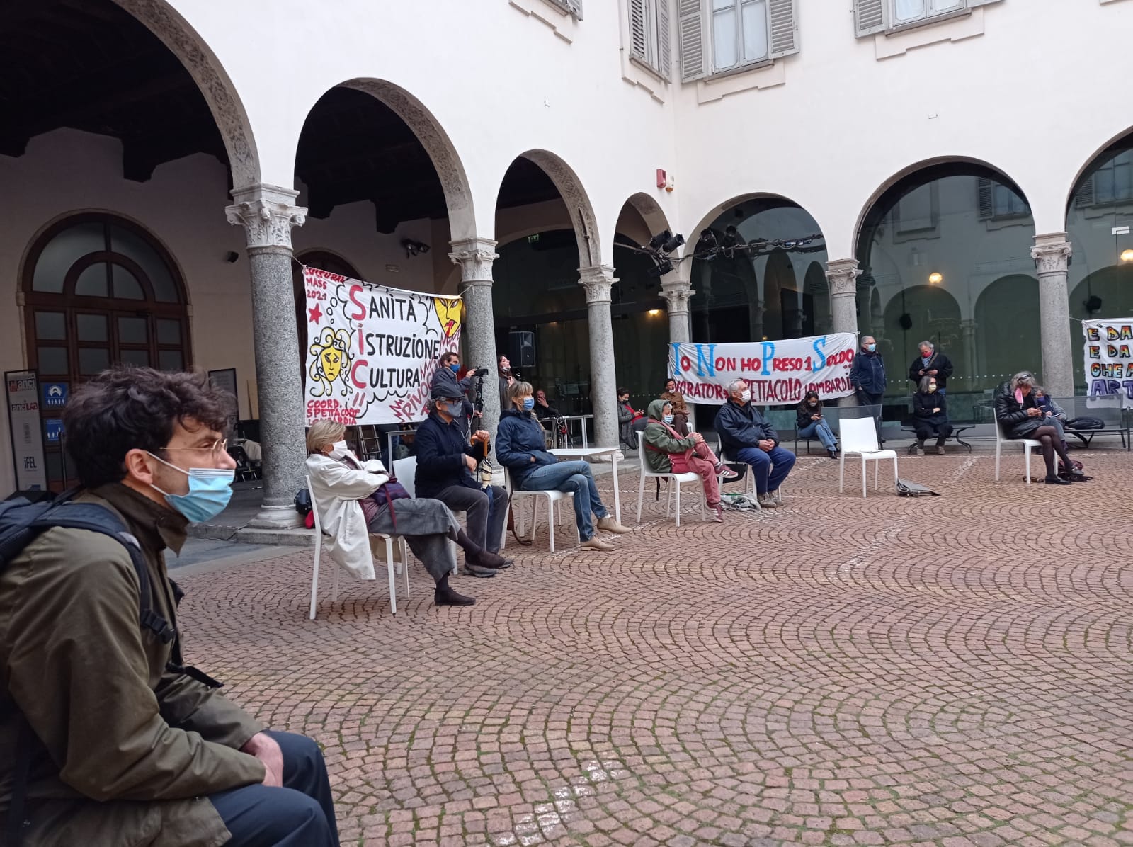 “Abbiamo preso questo posto il 27 di marzo per aprire uno spazio di dialogo all’interno del settore della cultura e dello spettacolo. Veniamo da un anno e più di lotte perché con la pandemia il nostro settore si è fermato completamente. Insieme vogliamo scrivere una proposta di riforma per il nostro settore, che non sia solo per noi ma per tutti i lavoratori discontinui e precari,” afferma Monia, rappresentante del Coordinamento Spettacolo Lombardia.