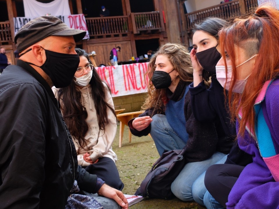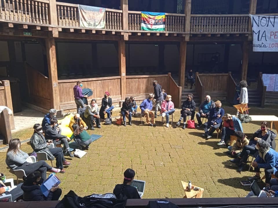La successione di interventi afferma che le rivendicazioni di chi attraversa il teatro quotidianamente vanno al di là di quelle di categoria. È interessante notare come invece si sviluppino alleanze e intersezionalità tra gruppi e tematiche che possono sembrare distanti tra loro. “Sanità, istruzione, cultura” si legge su un cartellone appeso nel cortile. È un ottimo riassunto per descrivere la varietà di riflessioni affrontate da un gruppo di persone (purtroppo limitato dal distanziamento sociale) che, come afferma Monia, “trovano in questo posto un luogo dove iniziare a costruire una nuova visione di futuro.”