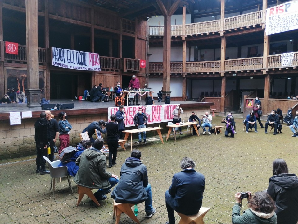 A partire dal teatro, per coinvolgere tutti i campi della cultura, e combattere precariato, violenza, sessismo. Un movimento nazionale e diffuso – da Milano a Napoli, da Padova a Torino a Barletta – con l’obiettivo di intrecciare le lotte e disegnare nuove forme di relazione con le istituzioni. Tremila persone hanno attraversato lo spazio scenico, in sicurezza, per dialogare intorno a tavoli di lavoro tematici aperti e inclusivi. Per portare proposte, percorsi personali e collettivi, raccontare e mettere a confronto difficoltà e fragilità, per lottare insieme per una più equa distribuzione delle risorse e del lavoro. Un dibattito per lo più condotto da chi si occupa di spettacolo, dalle maestranze agli artisti, ma in cui chiunque lavori nella cultura, dalle arti visive all’architettura fino all’editoria può riconoscersi. Per fare e rifare il mondo: Remake the Globe lo slogan. Un’azione estemporanea e densa di meraviglia, come ogni cosa che accade all’improvviso e rompe gli equilibri. Un’azione che a un anno dalla drammatica crisi che ha colpito il mondo dello spettacolo, a seguito dell’emergenza sanitaria, finalmente riesce a mettere sullo stesso tavolo Ministro della Cultura e Ministro del Lavoro, in un primo incontro avvenuto il 22 aprile e la cui sintesi è contenuta in un video online (qui sotto). Questo è solo l’inizio, “Vi stiamo addosso”, come recita uno degli striscioni.