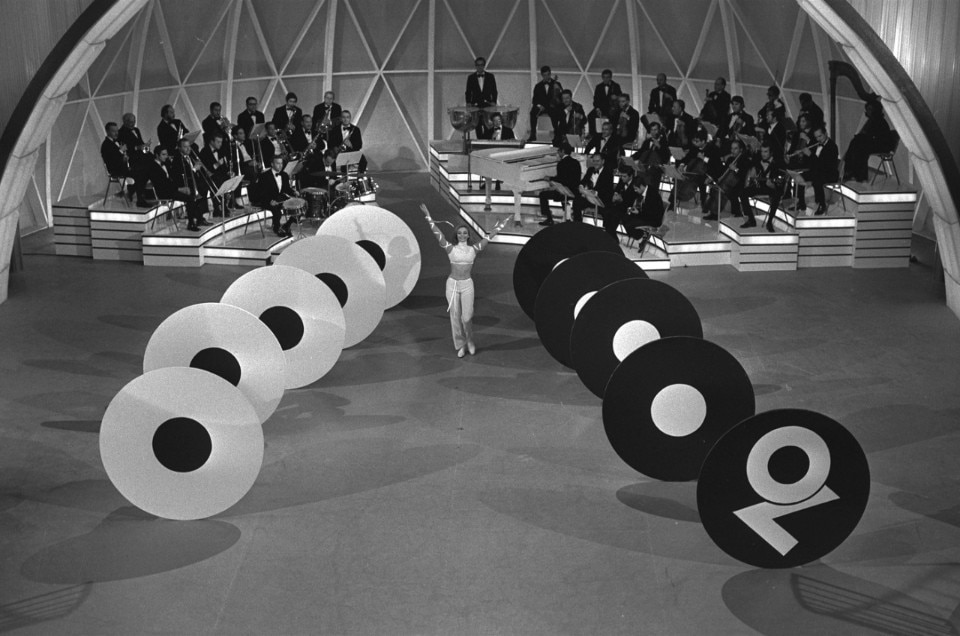 Tempo tre anni e le scene minimal-psichedeliche di Armando Nobili – similmente a quelle essenziali di Carlo Cesarini da Senigallia per Studio Uno – lasciano il passo a quelle di Tullio Zitkowsky che, sia architettonicamente che simbolicamente, lanciano l’Italia nel nuovo decennio. Mentre Carrà con una malizia che trova nella sua tutt’altro che ingenua leggerezza l’affermazione del discorso sul genere che infuoca il dibattito femminista del tempo, Zitkowsky concepisce un geodome dal gusto fantascientifico per le esibizioni dei cantanti in gara e per gli sketch del duo formato da Corrado e Raffaella. Lo scenografo romano fa un uso sapiente e pionieristico (sarà lui a curare una delle prime scenografie a colori della televisione pubblica e utilizzare un tappeto di erba “quasi vera” realizzata in rafia annodata a mano per lo show proto-ecologista C’è Celentano del 1972) dell’intera superficie dei teatri di posa, andando a collocare inusualmente il pubblico sui lati e introducendo i Settanta in RAI con tabelloni elettronici.