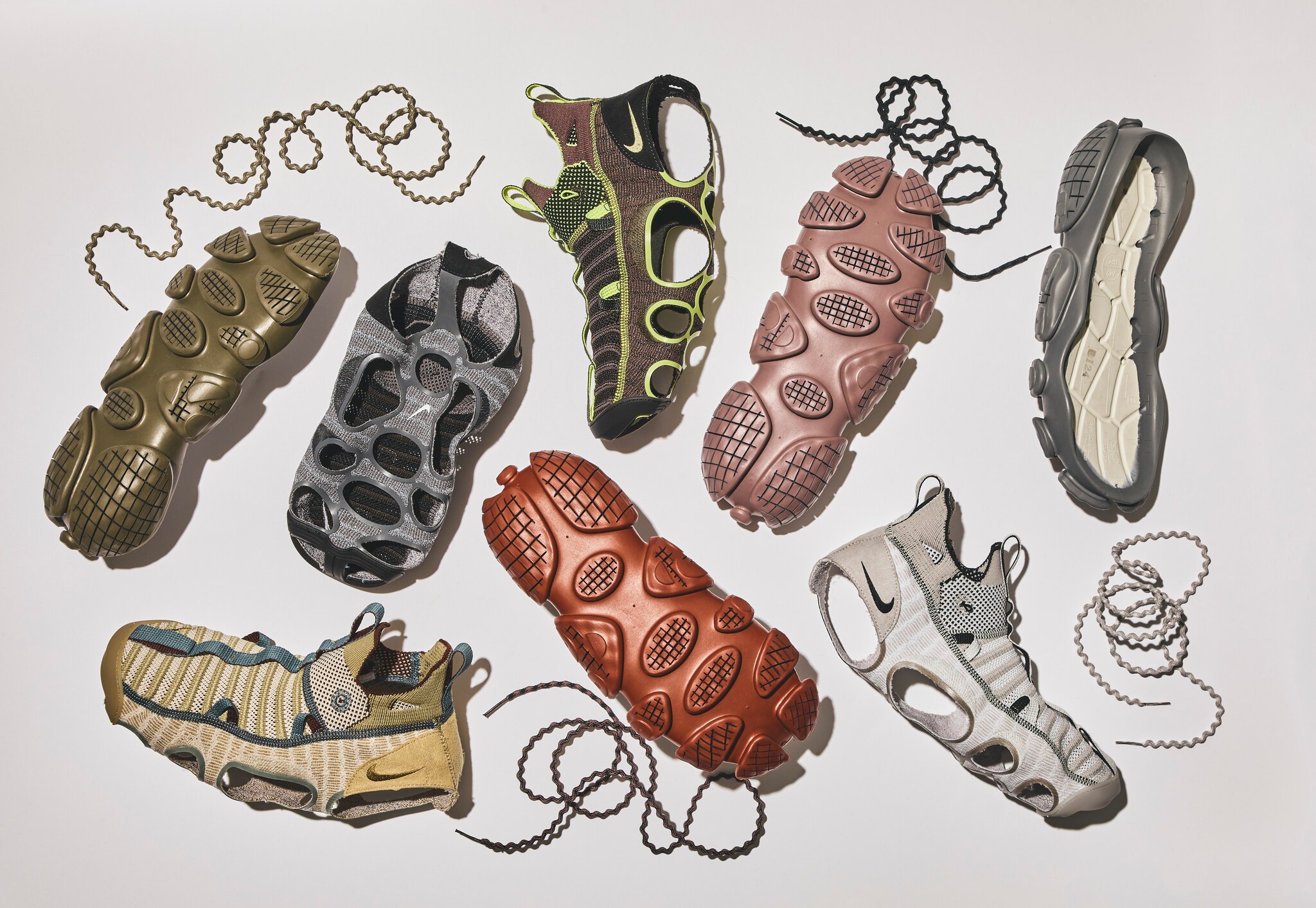 Un processo di (de)costruzione che Nike ambisce a comunicare nelle fotografie che accompagnano le nuove Ispa, mostrate con giocosità come il prodotto di tre componenti: una suola sinuosa e ultraleggera, decisamente contemporanea e quasi lunare, una tomaia in tessuto knitted e dei lacci, dall’aspetto altrettanto organico e nodoso.
