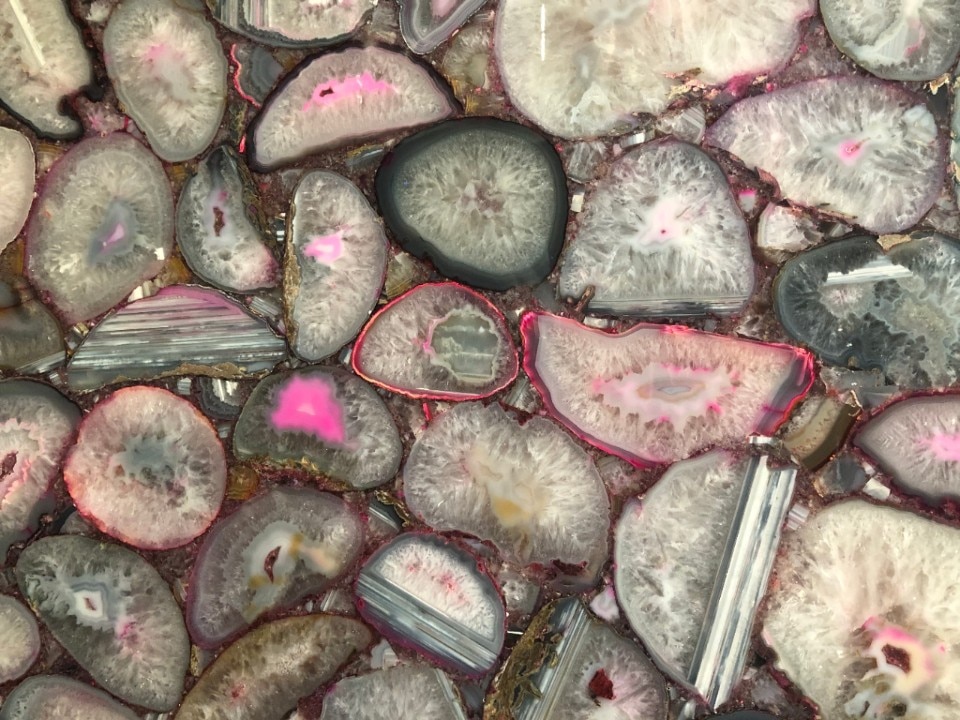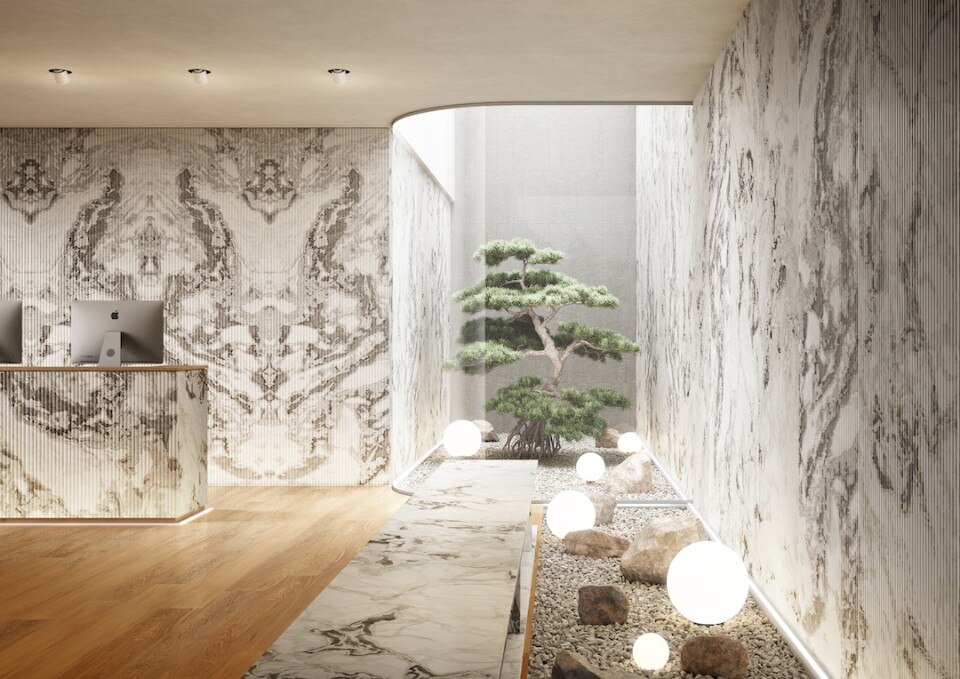 Addentrandosi nel Luxury Village si possono notare le diverse applicazioni delle superfici lapidee, e il modo in cui la stessa pietra, se trattata in modo differente, è in grado di creare scenari sempre diversi. Alcune lastre, traslucide in certi punti, sono retro-illuminabili, con un effetto totalmente diverso dall’originale, come nel caso della collezione Allight. Altre sono tenute insieme da resine che vengono appositamente colorate, su richiesta del cliente, per rispondere a esigenze più specifiche e personalizzate.