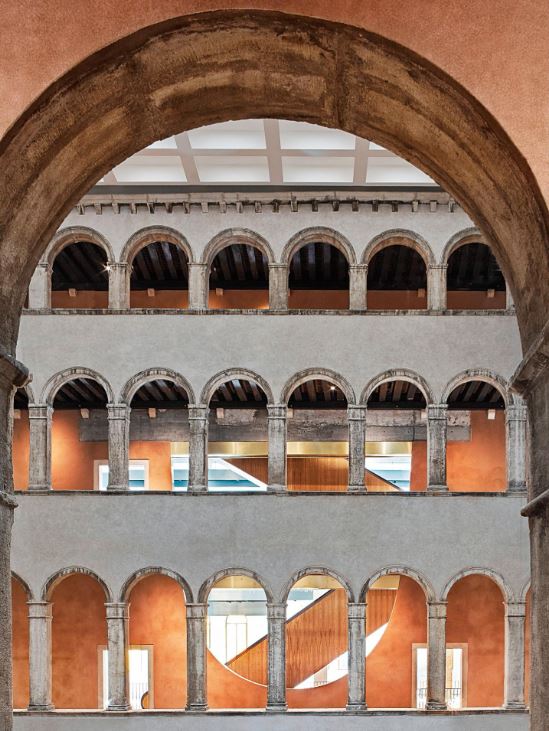 Testimoni delle diverse manipolazioni che ha subito in base alle funzioni che nel corso degli anni ha assunto, il Fondaco dei Tedeschi si mostra estremamente stratificato: nella sua versione originale, l’edificio a pianta quadrata ospitava addirittura affreschi di Tiziano e Giorgione, la maggior parte staccati e ricollocati in altre sedi perché ampiamenti danneggiati, perché a lungo esposti a intemperie e umidità. Ma porta con sé anche i segni dei riadattamenti del ’900 e il tipico calcestruzzo che non lascia dubbi sul periodo di intervento.