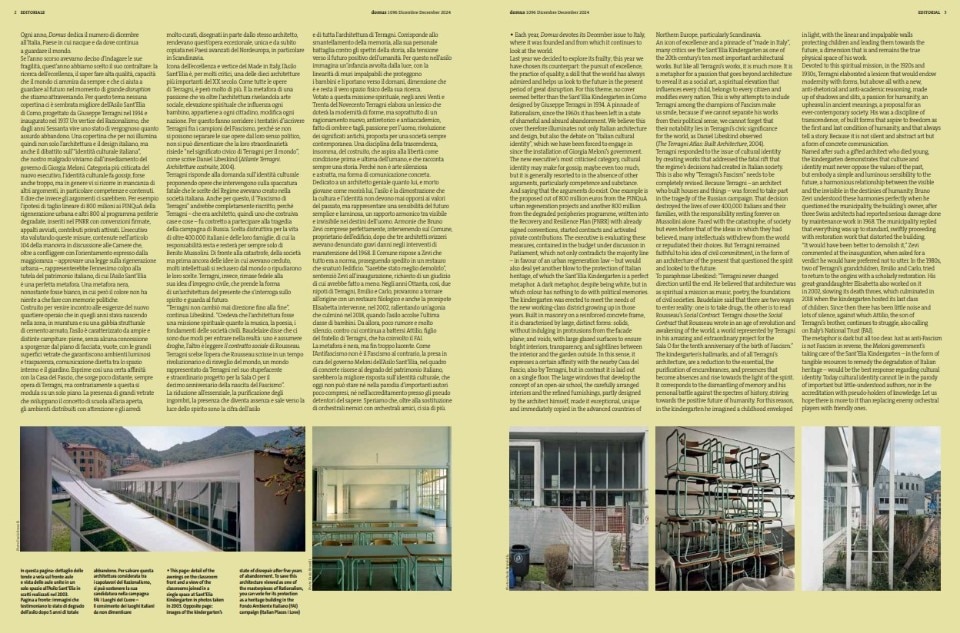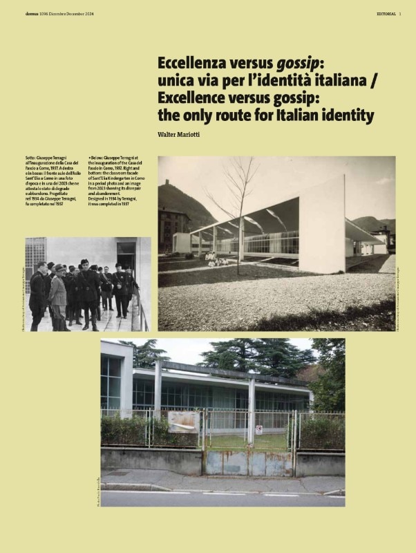 Per questo tema nessuna copertina ci è sembrata migliore dell’Asilo Sant’Elia di Como, progettato da Giuseppe Terragni nel 1934 e inaugurato nel 1937. Un vertice del Razionalismo, che dagli anni Sessanta vive uno stato di vergognoso quanto assurdo abbandono. Una copertina che per noi illumina quindi non solo l’architettura e il design italiano, ma anche il dibattito sull'“identità culturale italiana”, che nostro malgrado viviamo dall’insediamento del governo di Giorgia Meloni.