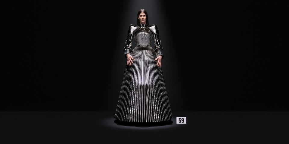 Un omaggio a Giovanna D’Arco, la scintillante armatura indossata da Eliza Douglas, con la gonna a campana stampata in 3D e laminata al cromo, in occasione della Couture Collection 2023. Con questo abito Demna voleva creare una realtà onirica dove un abito diventa un’armatura e una protezione, oltre che un ponte che connette l’io interiore e quello esteriore. L’abito oggi è esposto al Louvre di Parigi.